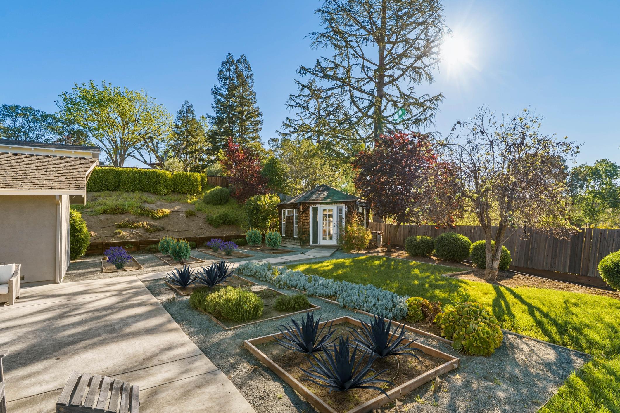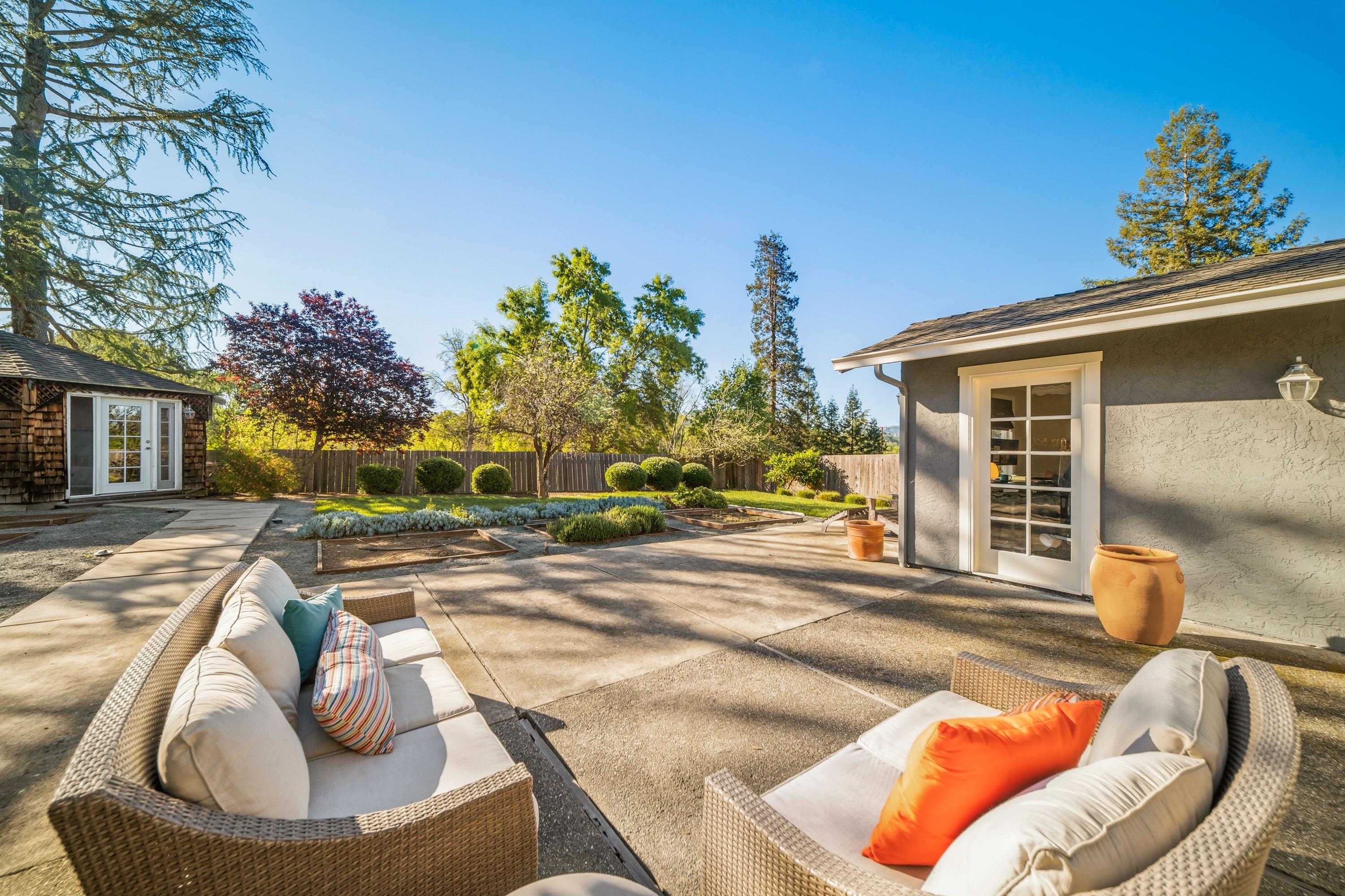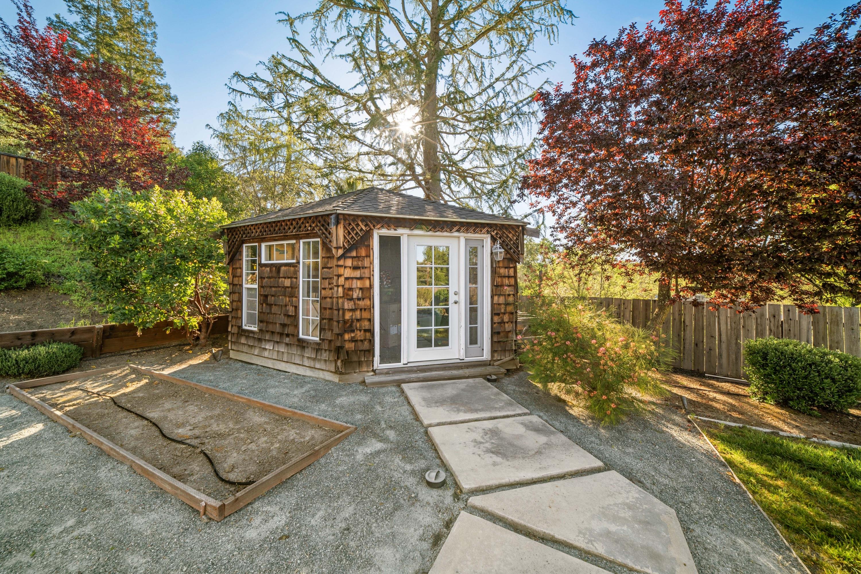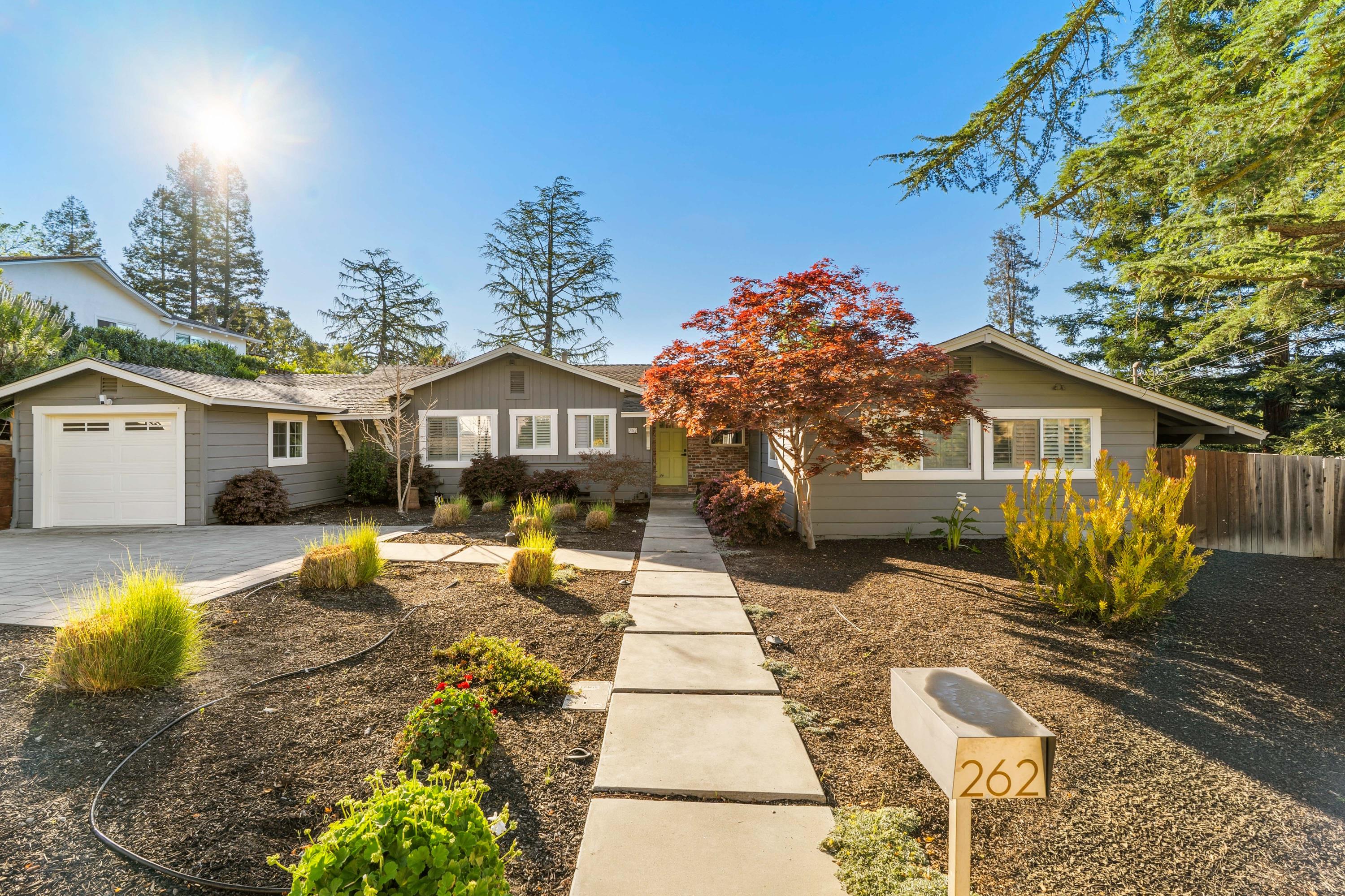 Welcome to this charming single story home nestled in the sought-after Cameo neighborhood boasting stunning views of Mt. Diablo. As you step inside, you’ll be greeted by refinished hardwood floors that flow throughout the home. The oversized living room features a shiplap vaulted ceiling, dual skylights bathing the space in natural light, dining area, and access outside to the patio—perfect for alfresco dining and relaxation. Adjacent to the dining area, the sunken family room offers a tray ceiling and double doors leading to the backyard. The remodeled kitchen showcases quartz countertops, tile backsplash, modern open shelving, soft-close cabinetry, breakfast bar, deep farmhouse sink with instant hot water and stainless steel appliances including a Thermador 6-burner range. Beyond the kitchen, you'll find two front-facing bedrooms with plantation shutters, an additional room - ideal for an office, and a laundry room complete with built-in storage and a folding station. The left wing of the home features a hall remodeled bath with modern finishes, a junior suite with an attached en-suite bathroom and the primary bedroom highlights include vaulted ceilings, dual mirrored closets, a large walk-in closet with built-ins, doors that open directly to the backyard, and an ensuite bathroom with soaking tub and stall shower. The backyard offers a spacious patio, lush lawn, garden beds, and a versatile outbuilding equipped with electricity and heat/air. The oversized stone driveway leads to a tandem 2-car garage with an EV charger. This picture perfect home is conveniently located near top-rated schools, trails and freeway access.