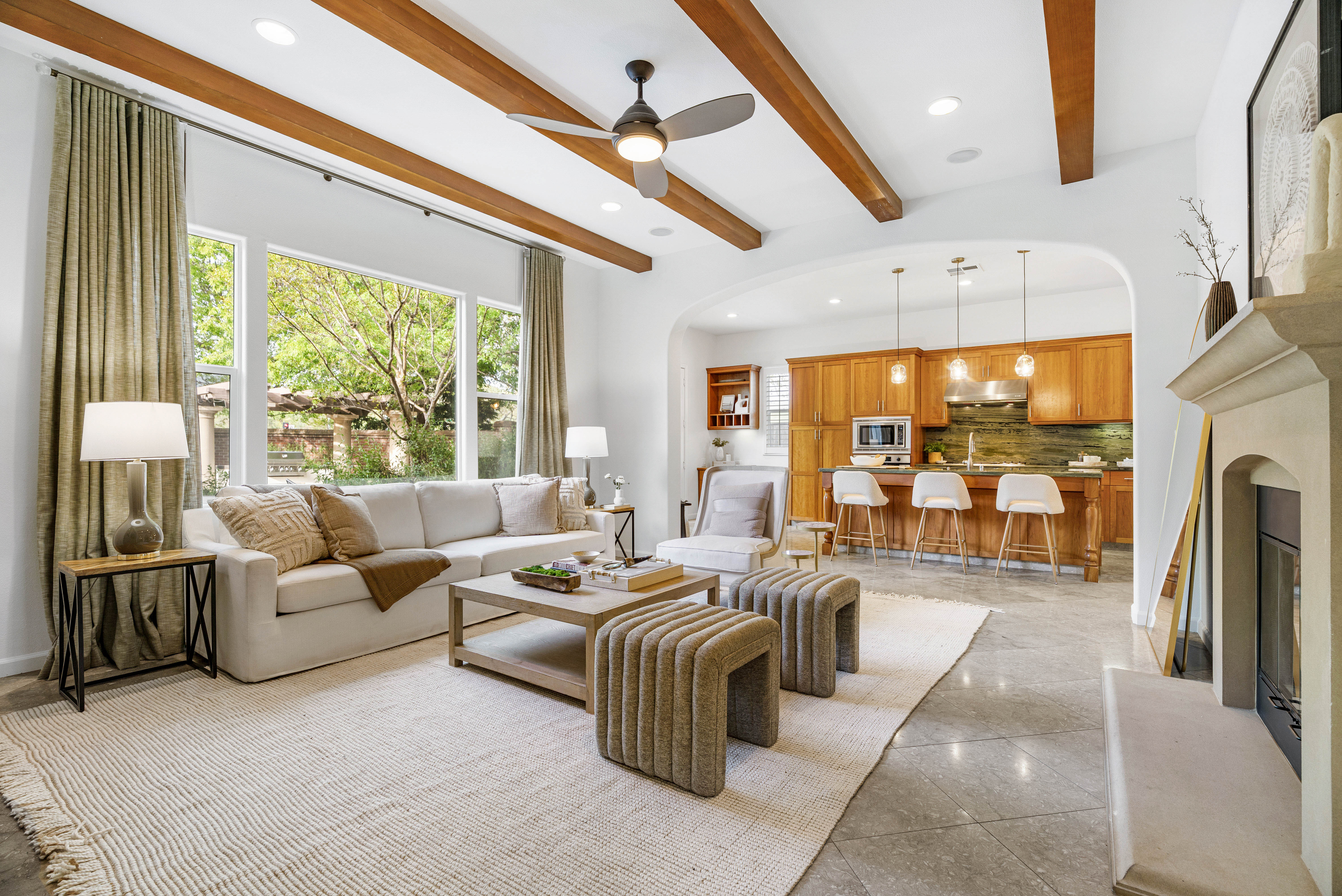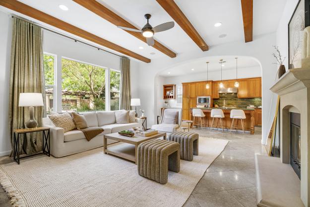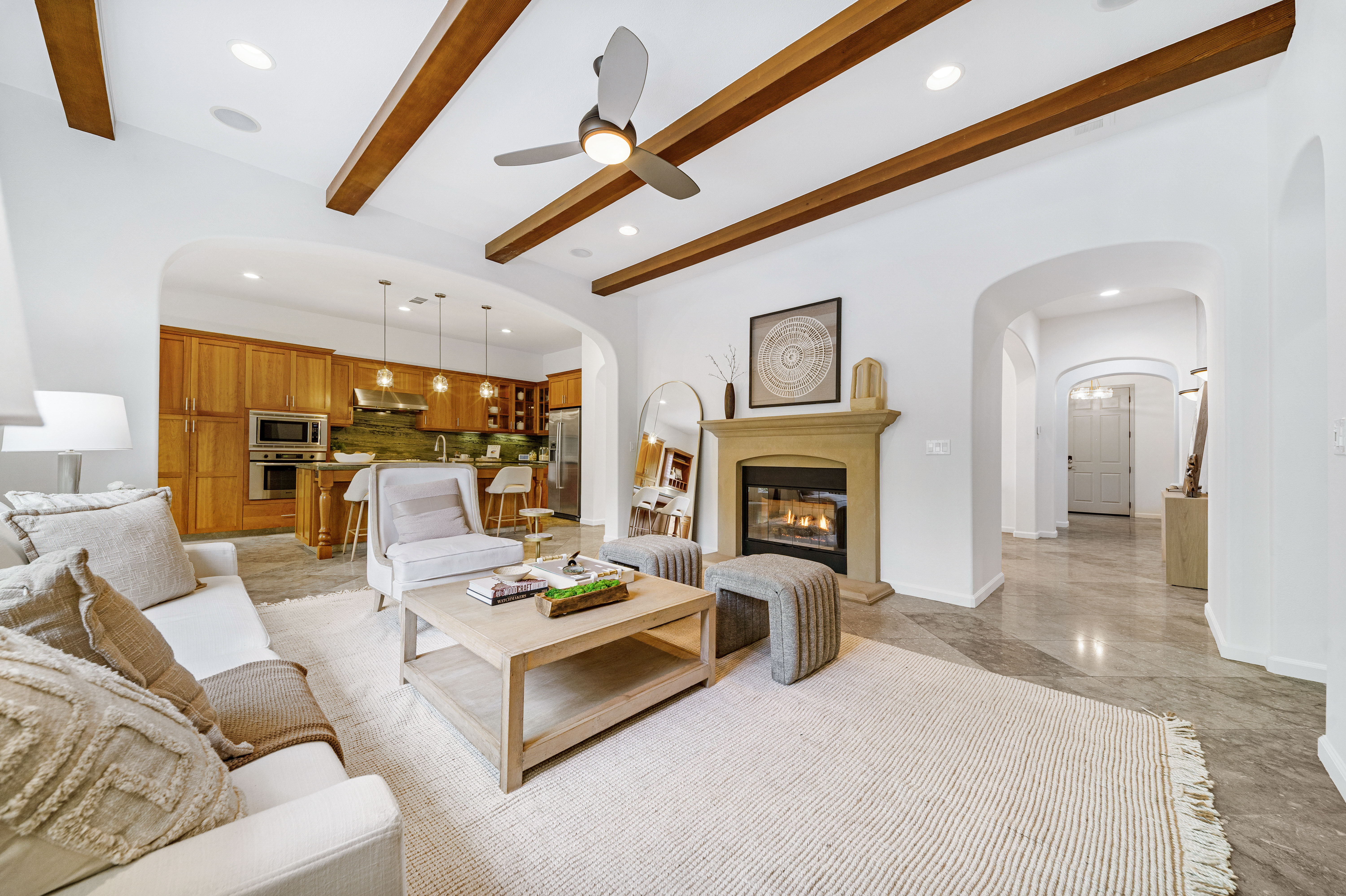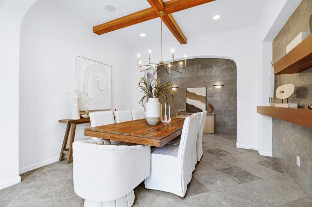 Designed for today’s lifestyle, the home features a stunning primary suite with views of the spectacular backyard. A separate wing offers two secondary bedrooms, one functioning as an executive-level office with custom built-ins—perfect for working from home in style. Natural light fills the living spaces, highlighting travertine floors, new carpet, and designer lighting. A formal dining room with doors to a private patio enhances the indoor-outdoor flow, while the high-end kitchen offers a center island and a built-in desk/workspace.