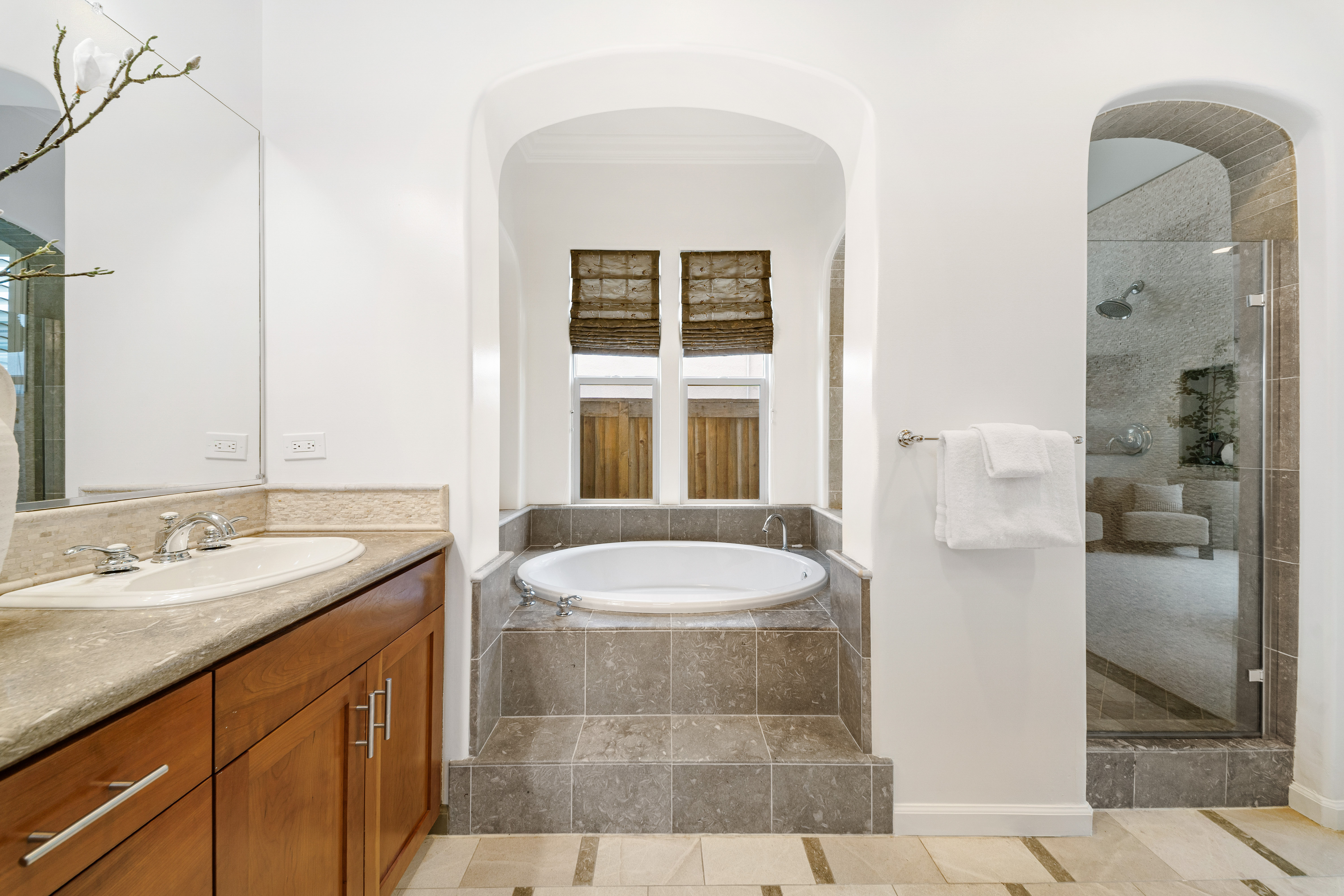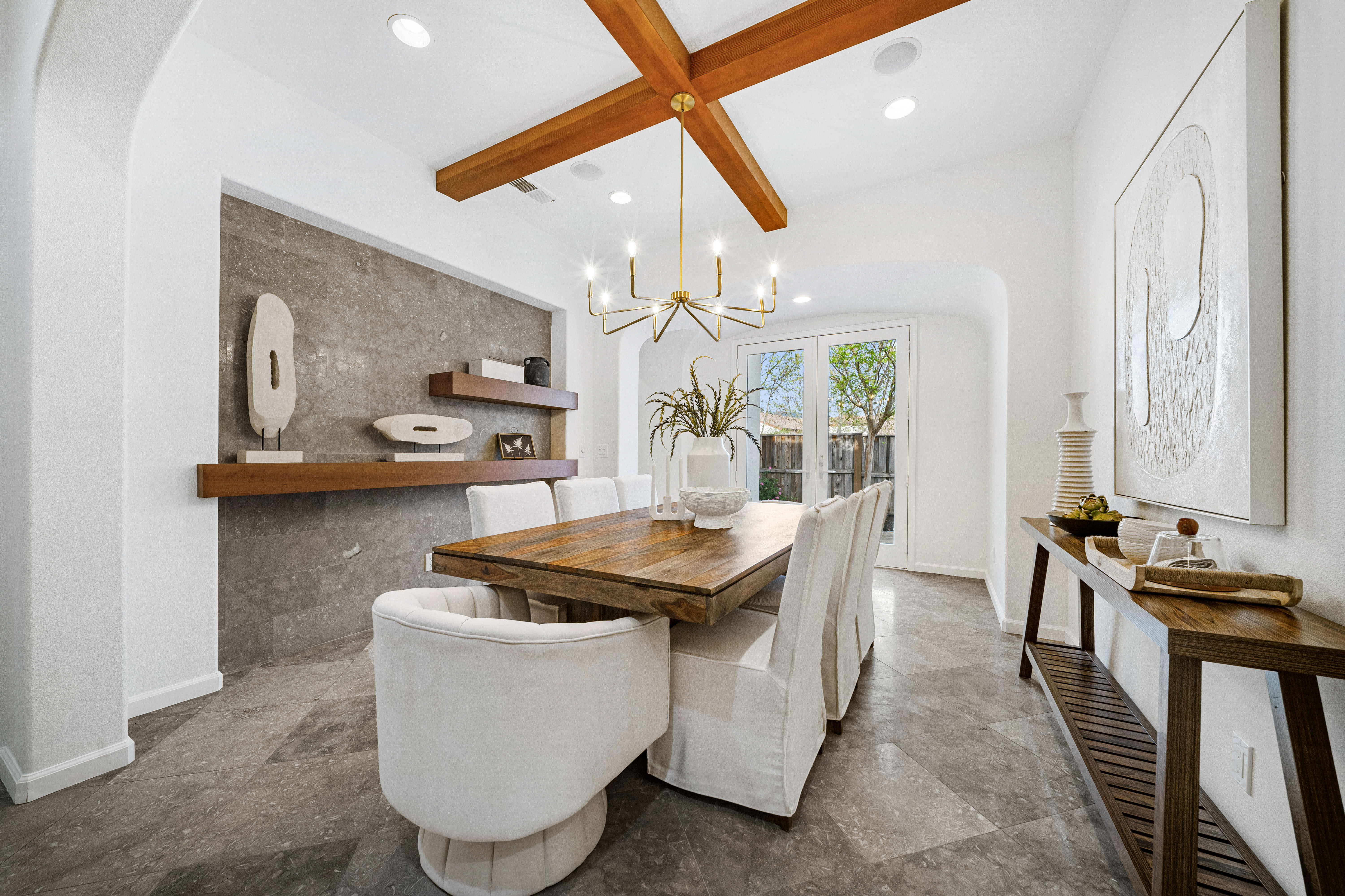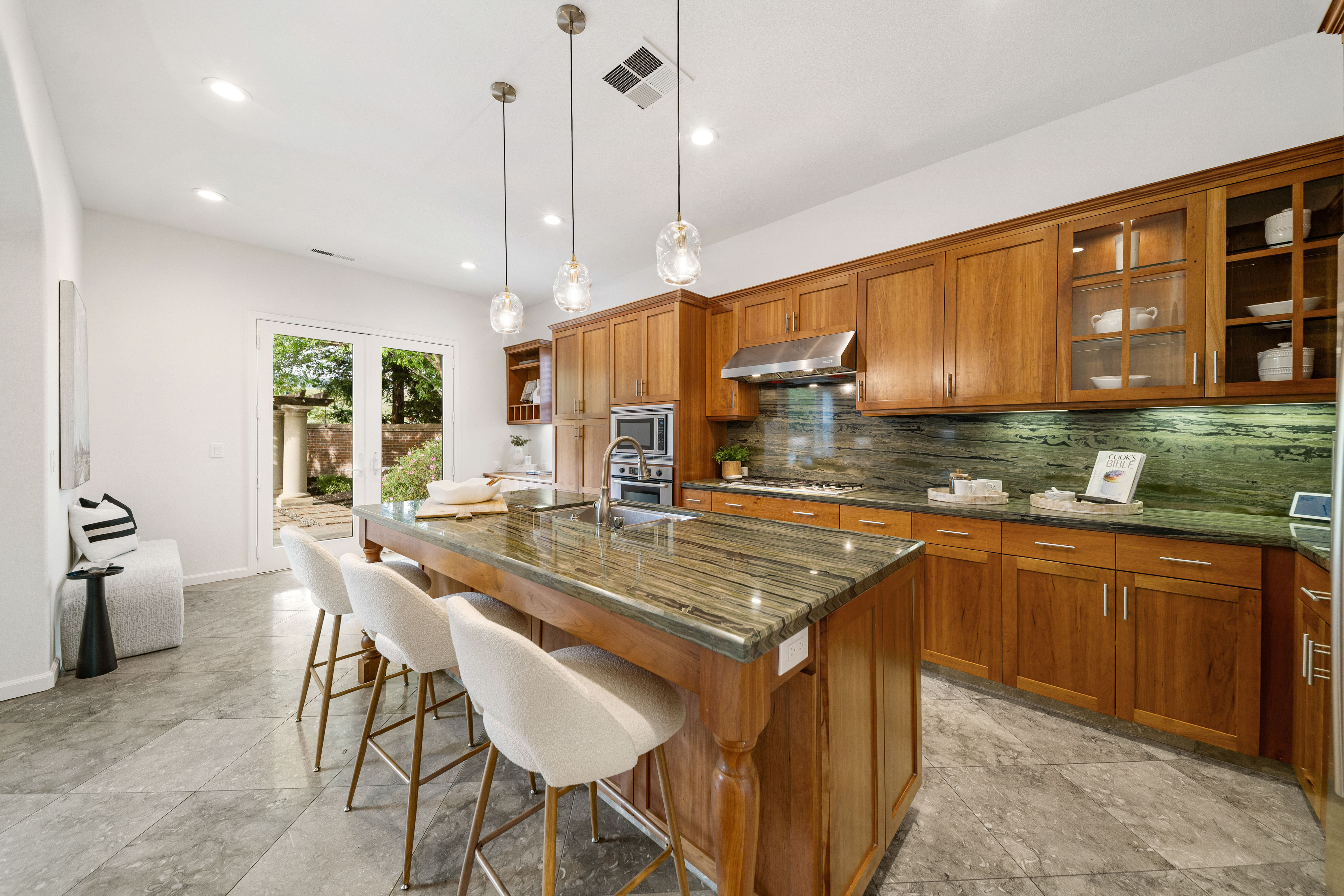 Designed for today’s lifestyle, the home features a stunning primary suite with views of the spectacular backyard. A separate wing offers two secondary bedrooms, one functioning as an executive-level office with custom built-ins—perfect for working from home in style. Natural light fills the living spaces, highlighting travertine floors, new carpet, and designer lighting. A formal dining room with doors to a private patio enhances the indoor-outdoor flow, while the high-end kitchen offers a center island and a built-in desk/workspace.