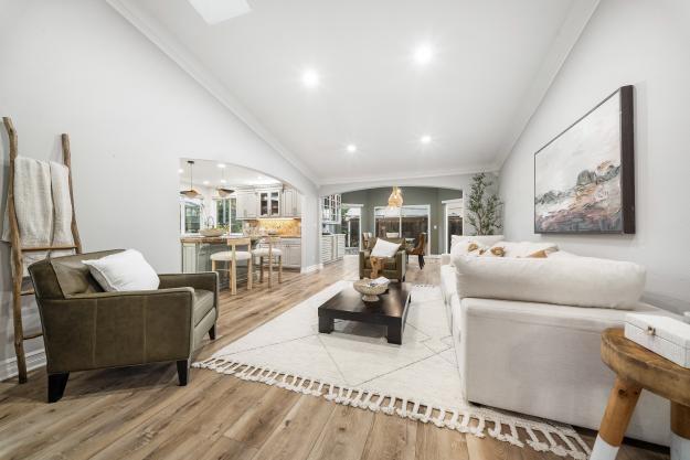 Inside, the bright and airy living room flows effortlessly into the family room and Chef’s kitchen, featuring freshly painted cabinetry, granite countertops, stainless appliances, and a breakfast bar island perfect for casual dining or entertaining. The dining area, framed by expansive windows, fills the home with natural light and opens directly to the backyard for ideal indoor-outdoor flow.