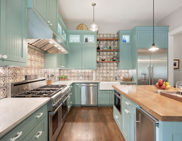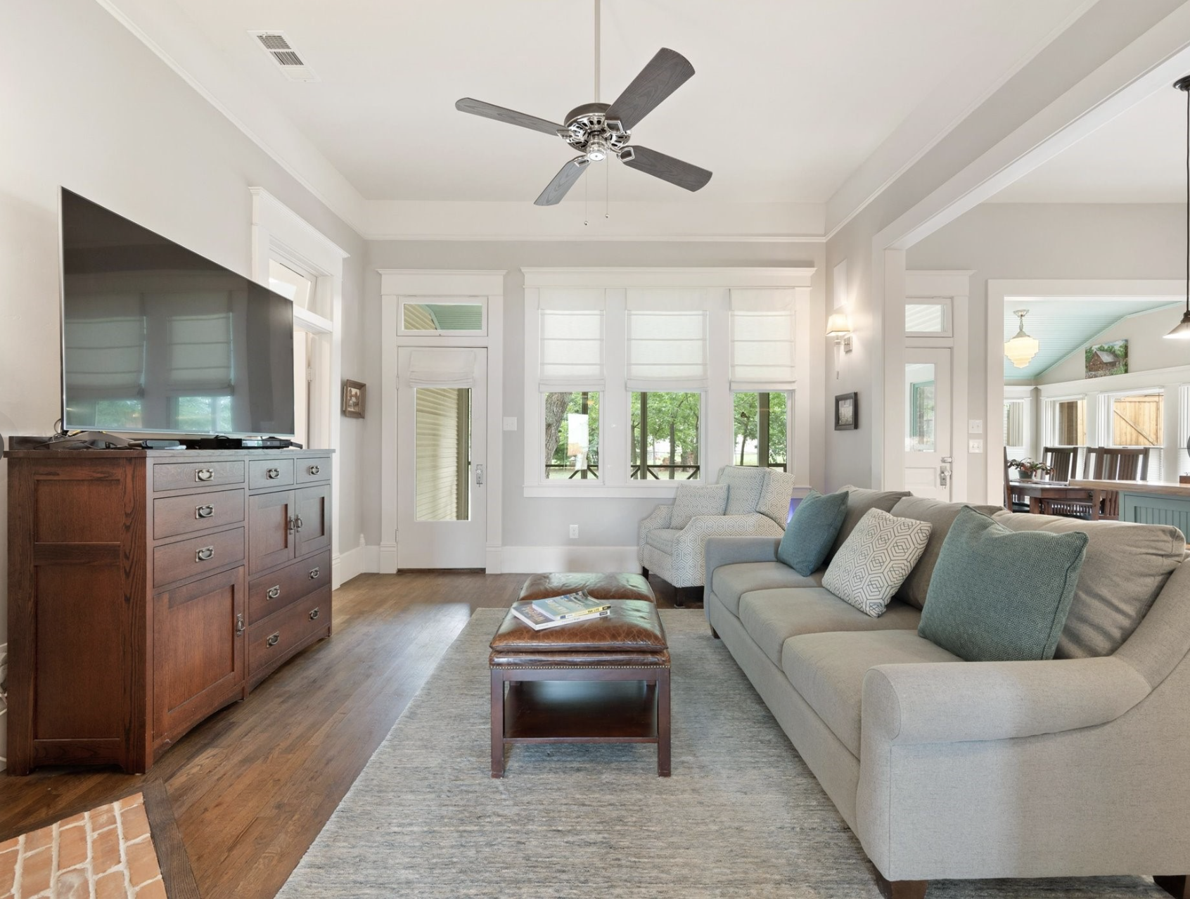 The thoughtful layout features a first-floor primary suite with spa-like bath, a guest suite, a light-filled great room, and a chef’s kitchen with Thermador appliances. Upstairs, two additional ensuite bedrooms accompany a second living area and flexible office or studio space. Period details—hardwood floors, preserved trimwork, and antique-inspired fixtures—blend seamlessly with modern updates and energy-efficient systems.