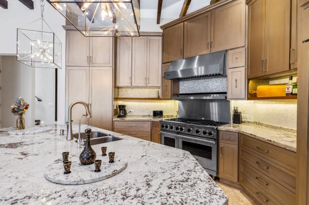 The second level offers privacy and comfort. A spacious guest suite features its own sitting area and gas fireplace, while a versatile office/TV room with en-suite bath can serve as an overflow bedroom. The highlight of this floor is the luxurious primary suite—a light-filled sanctuary with fireplace, generous proportions, and a spa-like bathroom complete with a soaking tub, double sinks, makeup vanity, and a vaulted bóveda ceiling that adds architectural drama. A large walk-in closet completes this refined retreat.