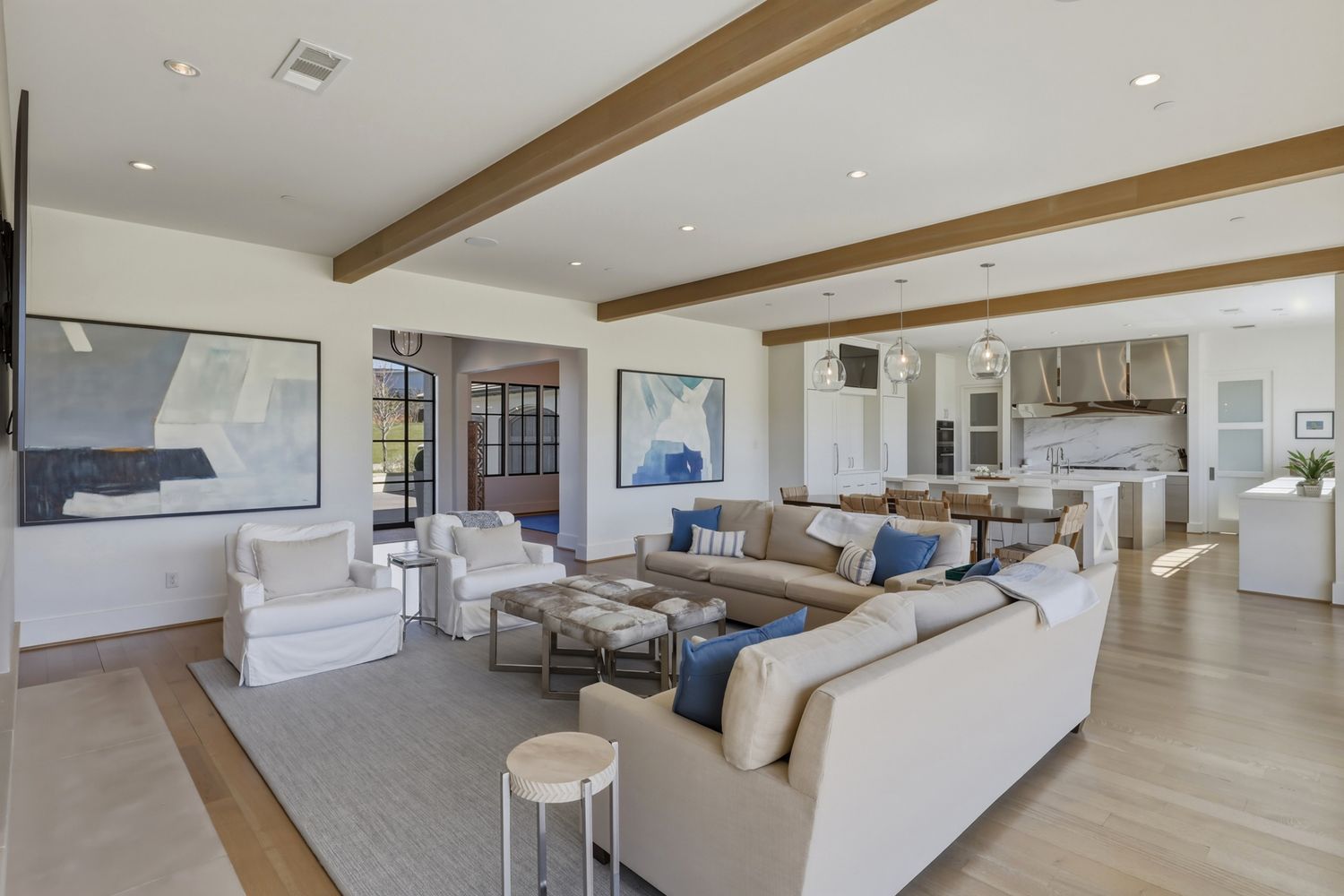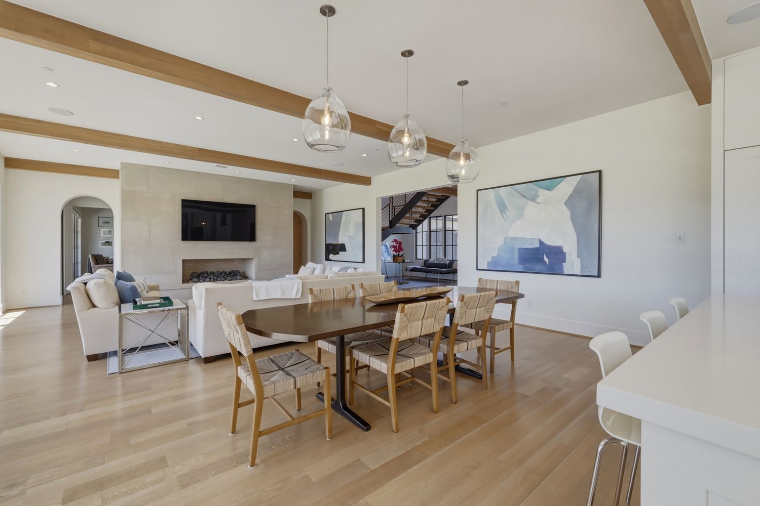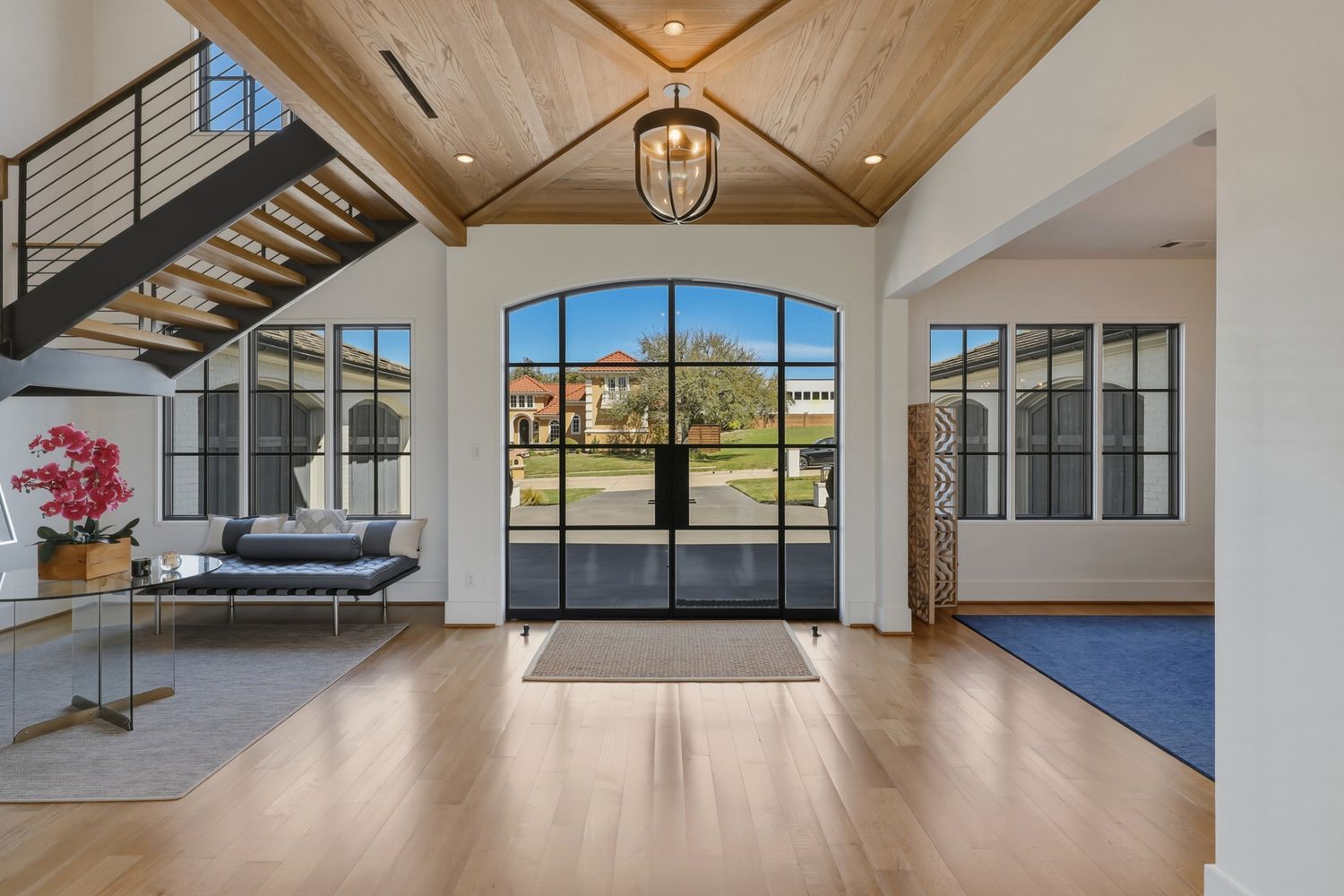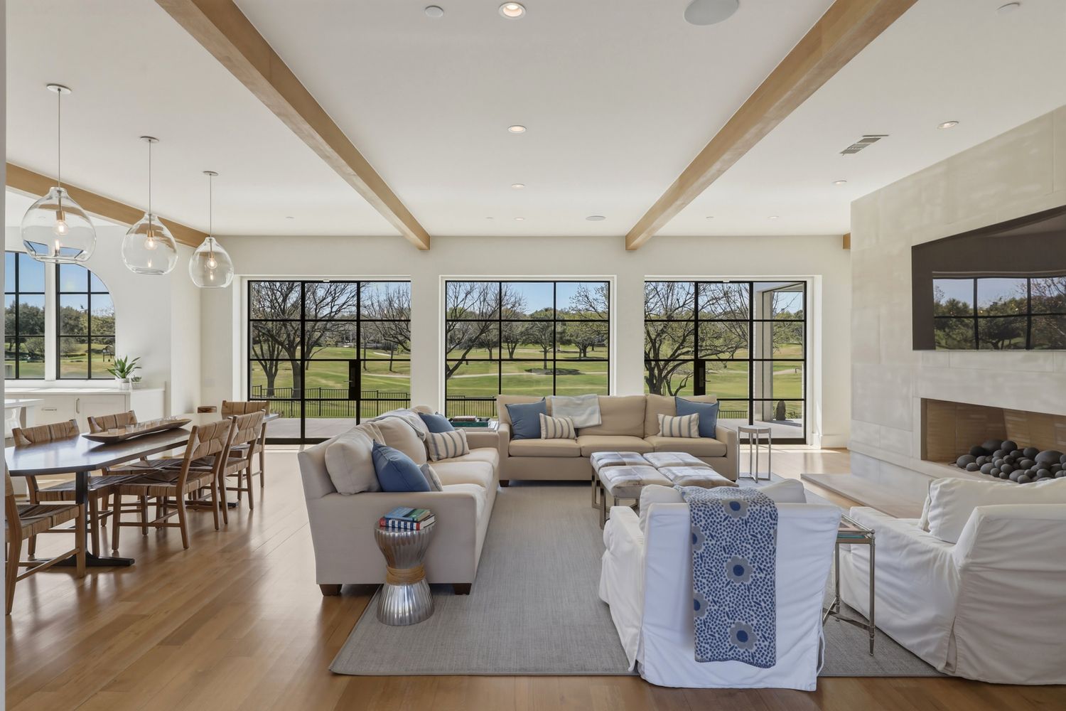 A dramatic entry with arched glass doors and a floating wood staircase opens to a light-filled great room, where expansive windows frame sweeping golf course vistas. White oak floors, exposed wood beams, and a limestone fireplace add warmth and sophistication throughout.