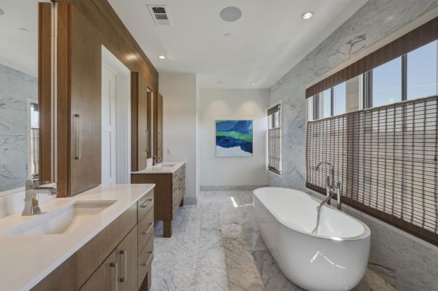 The open-concept kitchen is designed for both daily living and entertaining, featuring custom cabinetry, premium appliances, dual islands, and a separate prep kitchen. A flexible layout includes two primary suites—one on each level—ideal for guests or multigenerational living. The upstairs primary retreat offers a private balcony and spa-like bath.