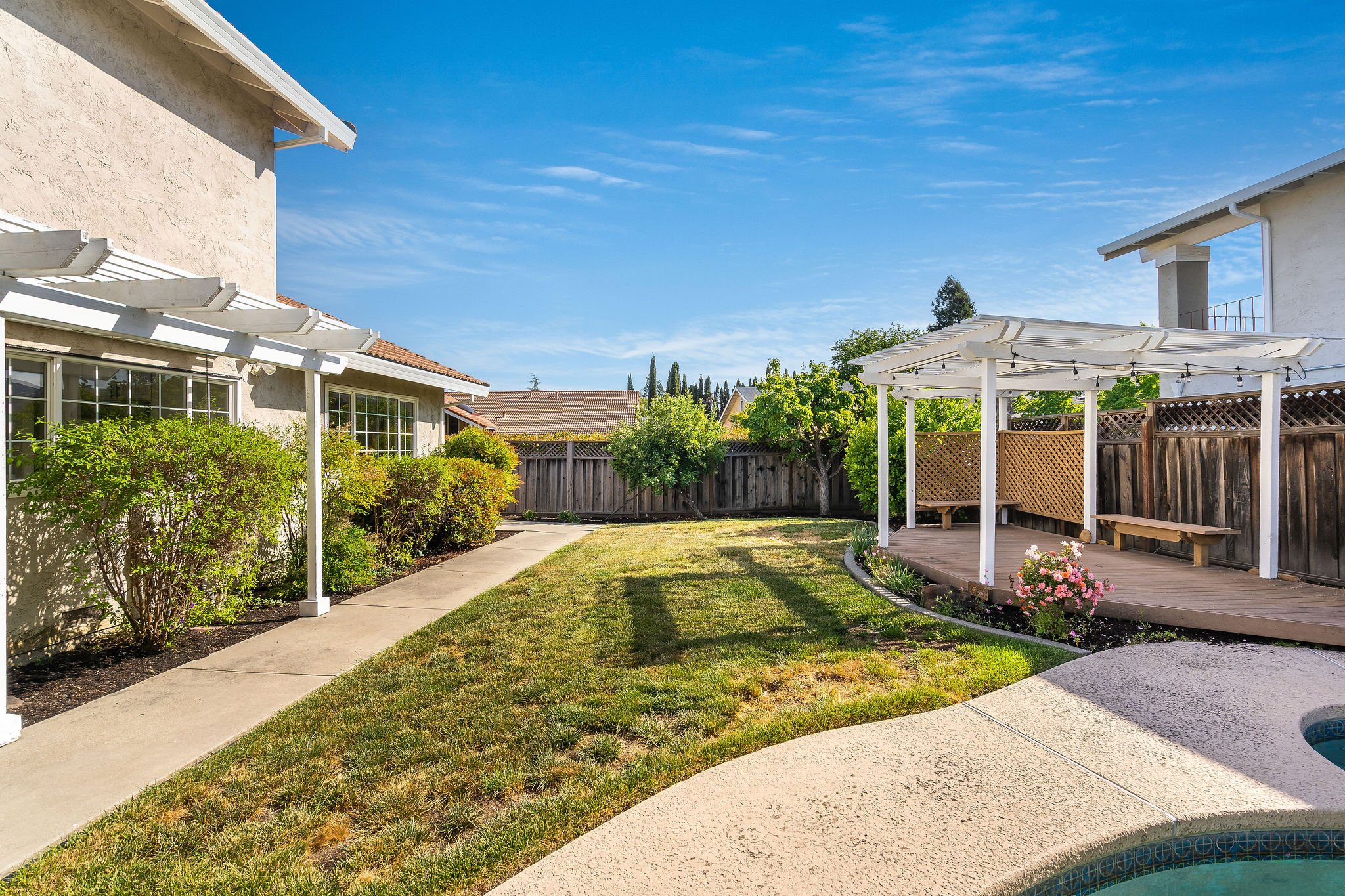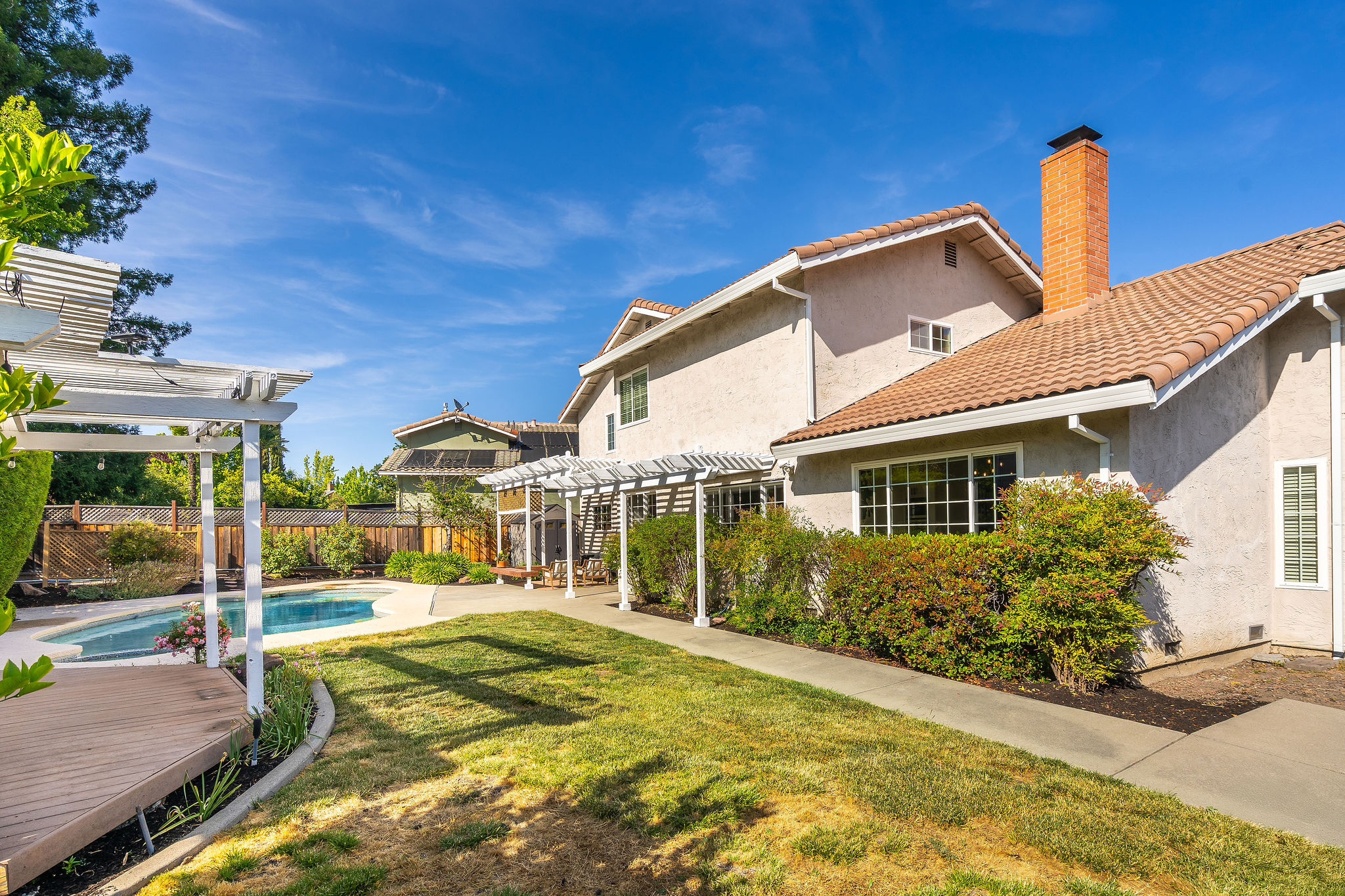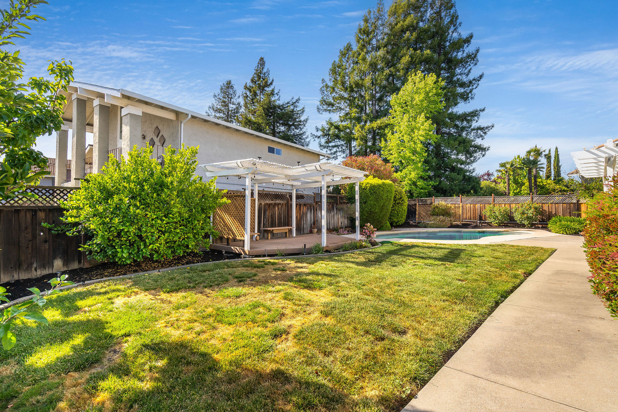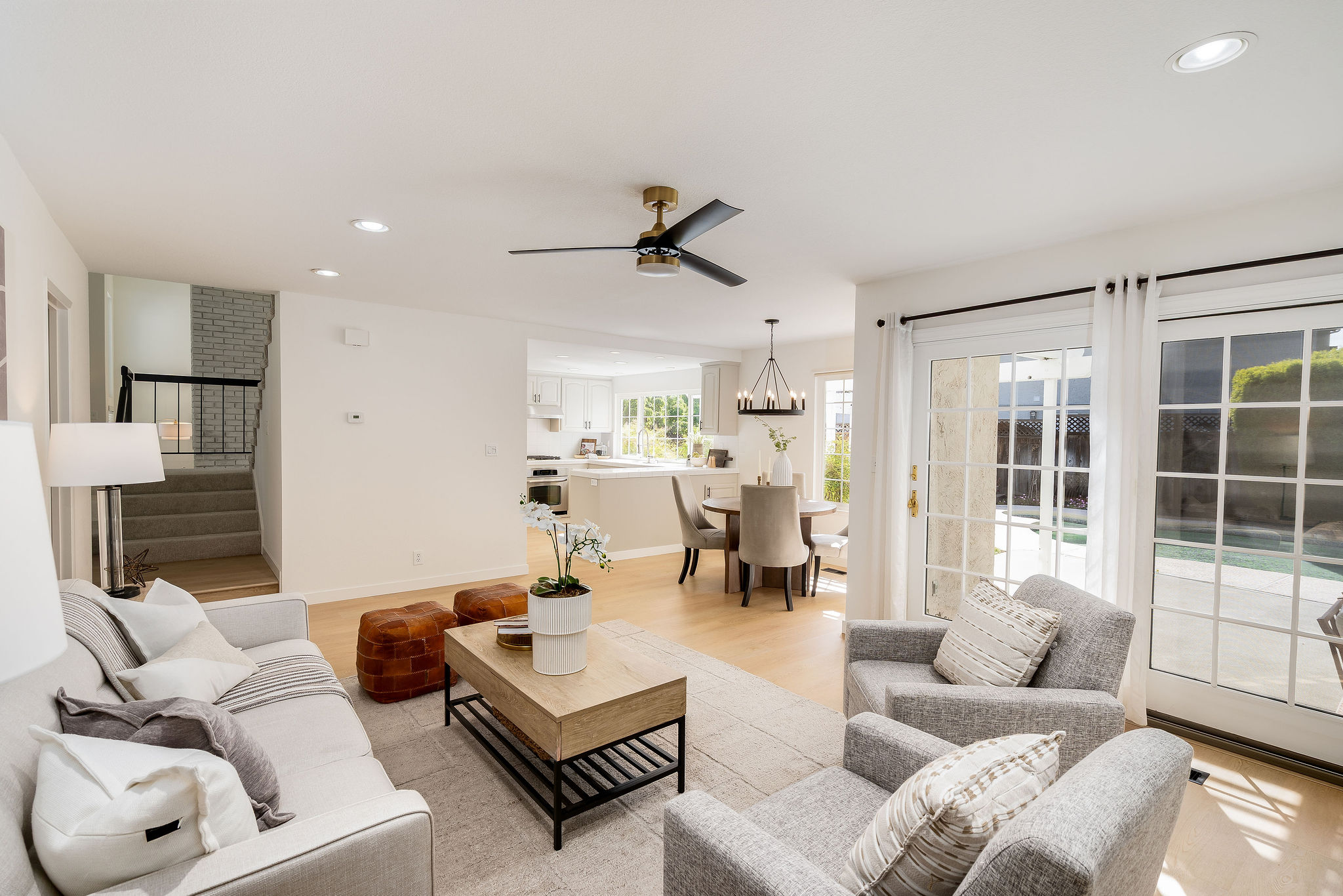 Located on a corner lot in a cul-de-sac in the Rancho Ramon neighborhood, this move-in ready home has been beautifully updated throughout. As you enter, you'll be greeted by fresh interior paint, brand-new LVP flooring, new fixtures and vaulted ceilings. The spacious living room features a brick fireplace and a sunken sitting area, seamlessly flowing into the formal dining room. The kitchen is appointed with newly painted cabinets, tile countertops, a walk-in pantry, stainless steel appliances, and a breakfast nook overlooking the yard. The inviting family room offers recessed lighting and a sliding glass door that leads to the backyard. On the main floor, you'll find a laundry room, full bathroom and large bedroom providing flexibility for guests, home office use or multi-generational living. Upstairs, the expansive primary bedroom suite is complete with an ensuite bathroom showcasing dual sinks and a walk-in closet. Three additional front facing bedrooms share a hall bathroom on this level. The backyard boasts a patio, lush lawn, sparkling swimming pool, and a deck with a pergola. This two-story home is walking distance to The Iron Horse Trail and Montevideo Elementary School, and near shopping and 680 FWY. No HOA.