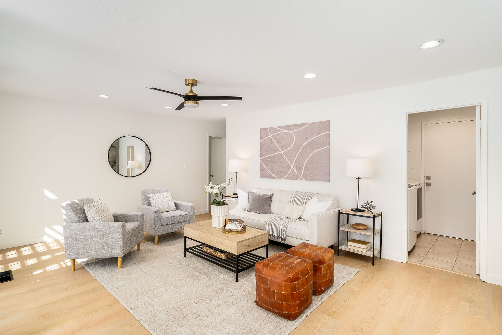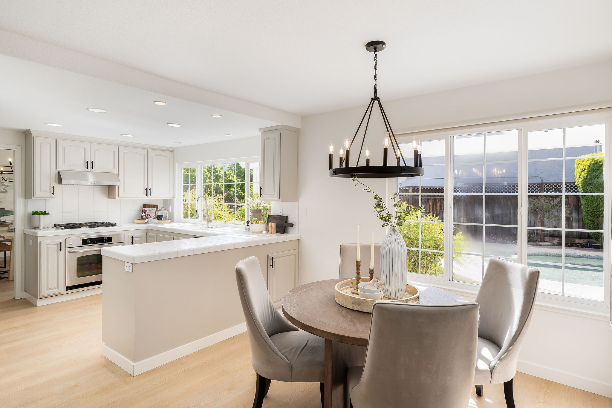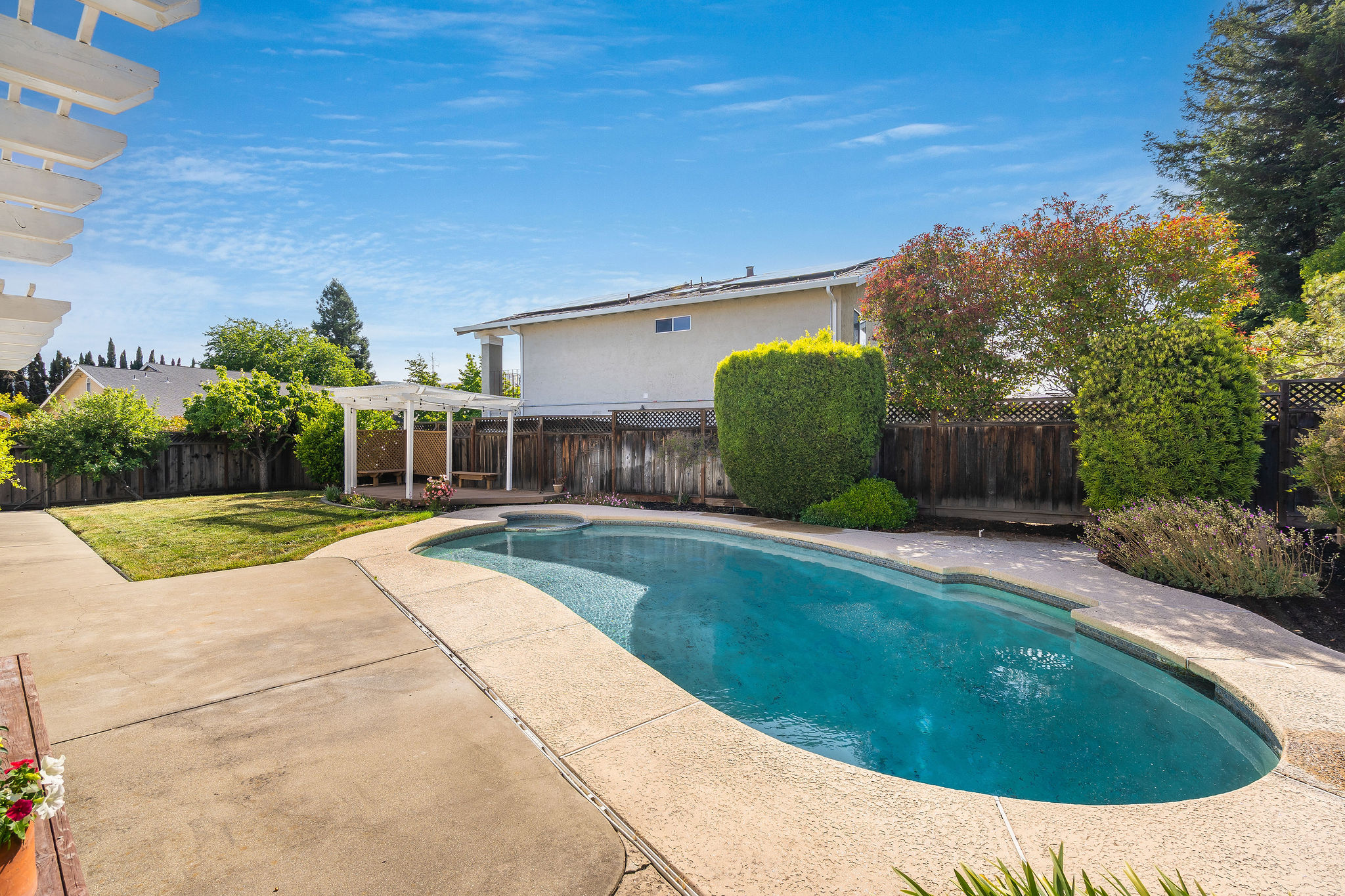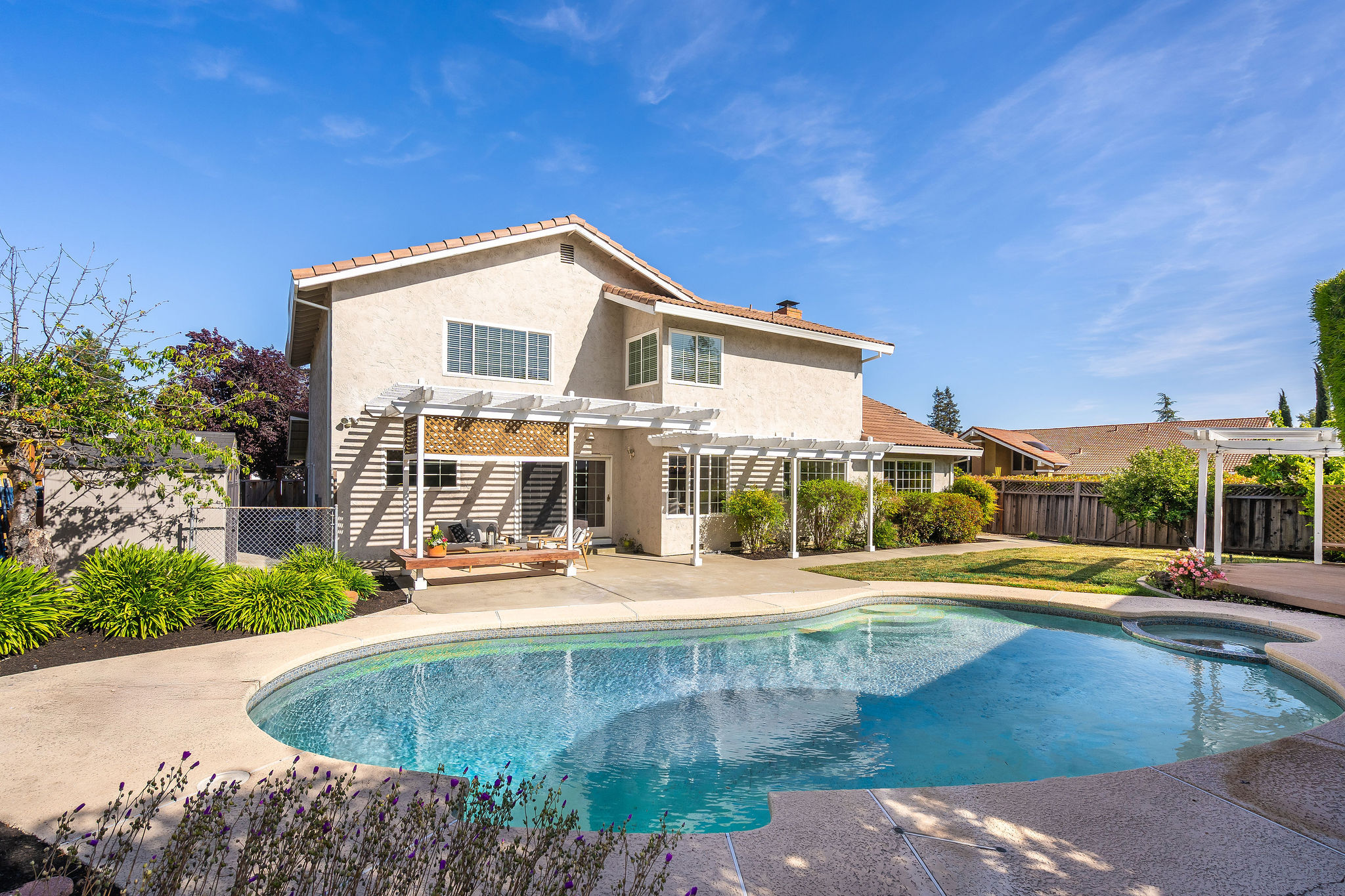 Located on a corner lot in a cul-de-sac in the Rancho Ramon neighborhood, this move-in ready home has been beautifully updated throughout. As you enter, you'll be greeted by fresh interior paint, brand-new LVP flooring, new fixtures and vaulted ceilings. The spacious living room features a brick fireplace and a sunken sitting area, seamlessly flowing into the formal dining room. The kitchen is appointed with newly painted cabinets, tile countertops, a walk-in pantry, stainless steel appliances, and a breakfast nook overlooking the yard. The inviting family room offers recessed lighting and a sliding glass door that leads to the backyard. On the main floor, you'll find a laundry room, full bathroom and large bedroom providing flexibility for guests, home office use or multi-generational living. Upstairs, the expansive primary bedroom suite is complete with an ensuite bathroom showcasing dual sinks and a walk-in closet. Three additional front facing bedrooms share a hall bathroom on this level. The backyard boasts a patio, lush lawn, sparkling swimming pool, and a deck with a pergola. This two-story home is walking distance to The Iron Horse Trail and Montevideo Elementary School, and near shopping and 680 FWY. No HOA.