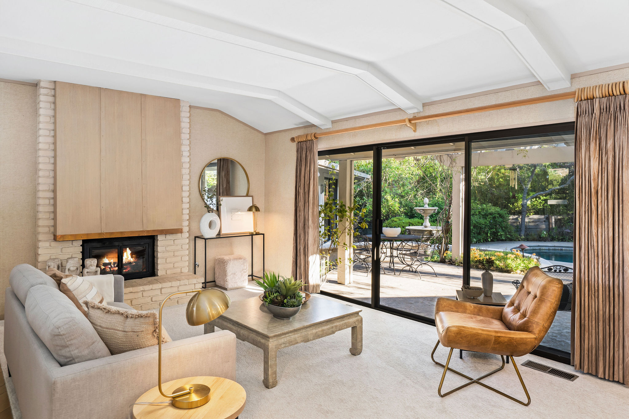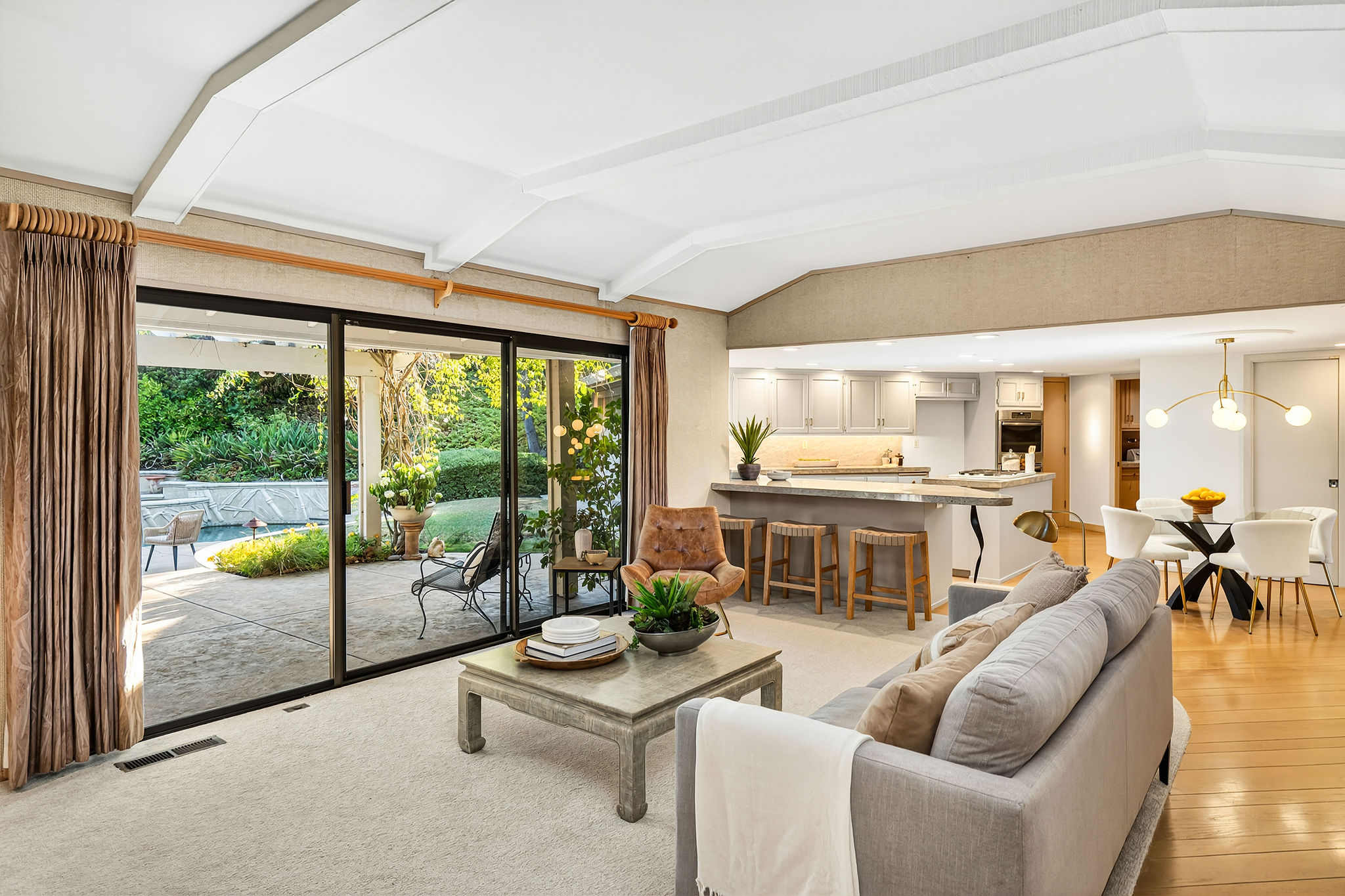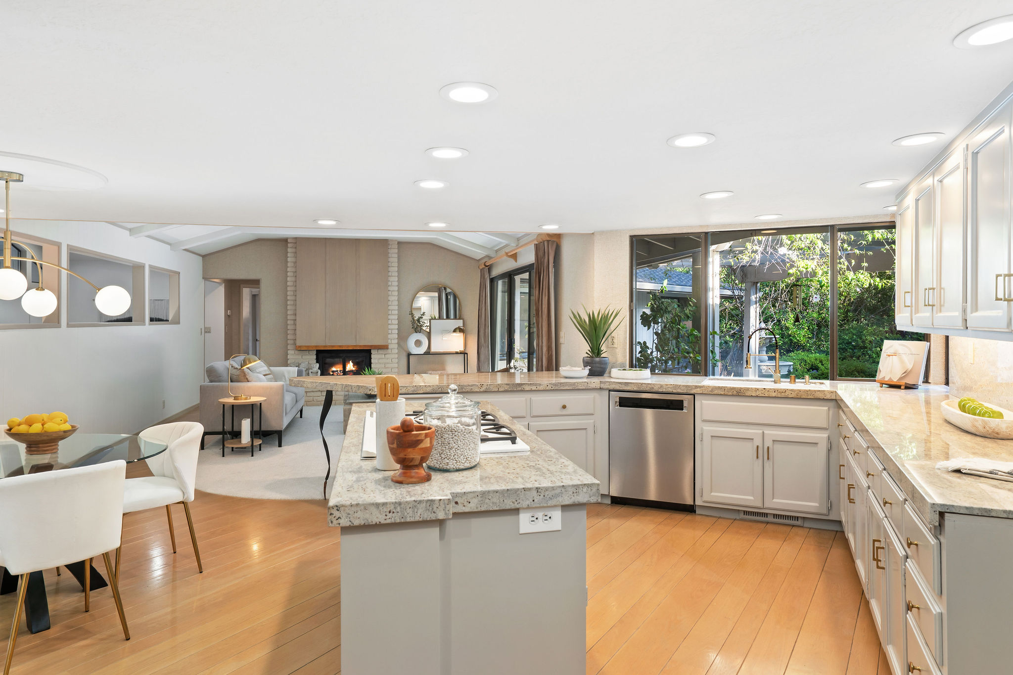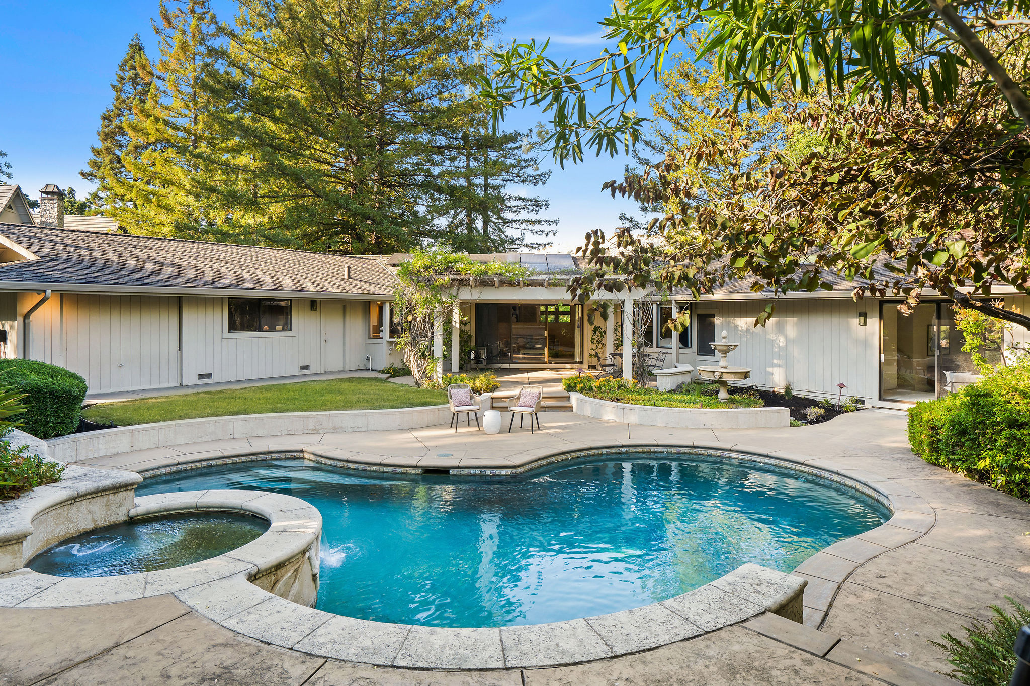 Perched on a cul-de-sac in the desirable Whitegate neighborhood, this single-story Harold Smith-built home offers a versatile floor plan & Mt. Diablo views. Inside, natural light, a neutral palette & light oak hardwood floors welcome you. Adjacent to the formal dining room, the sunken living room features a brick fireplace & walls of windows framing hillside views. The spacious kitchen boasts a center island, breakfast bar, double ovens, stone counters, walk-in pantry, built-in desk & nook, opening to the family room w/fireplace & slider to the patio. Three secondary bedrooms include closet built-ins, one w/a desk. Hall bath offers a soaking tub & stall shower. The private primary suite includes vaulted ceilings, sitting area, dual closets & remodeled bath w/dual sinks & make-up vanity. Outdoors, enjoy a pergola-covered patio, pool/spa w/cascading waterfall & lush landscaping. Other features include 3 car garage, new roof installed June 2025, owned solar & Tesla backup battery. Near top-rated schools & trails.