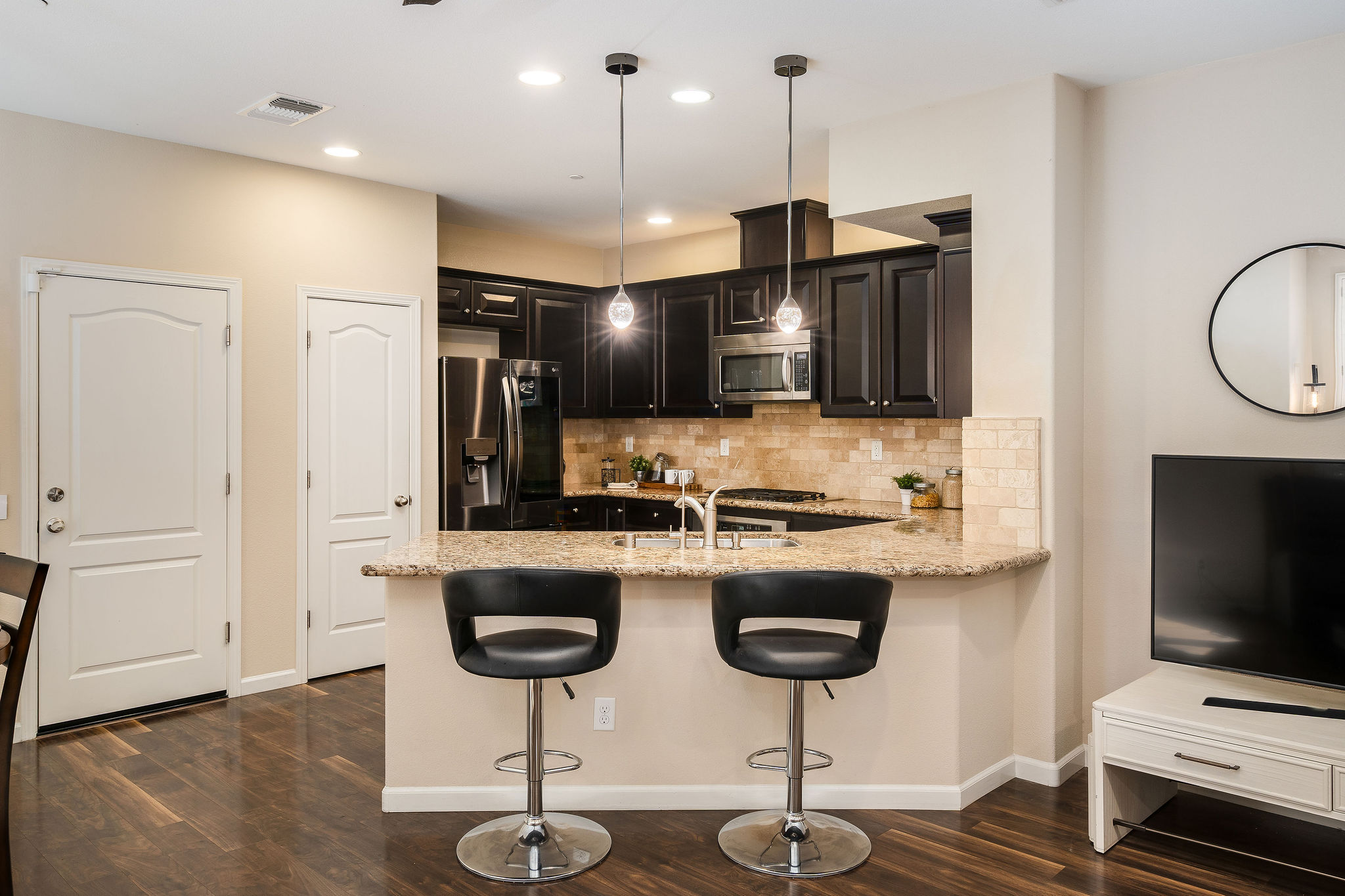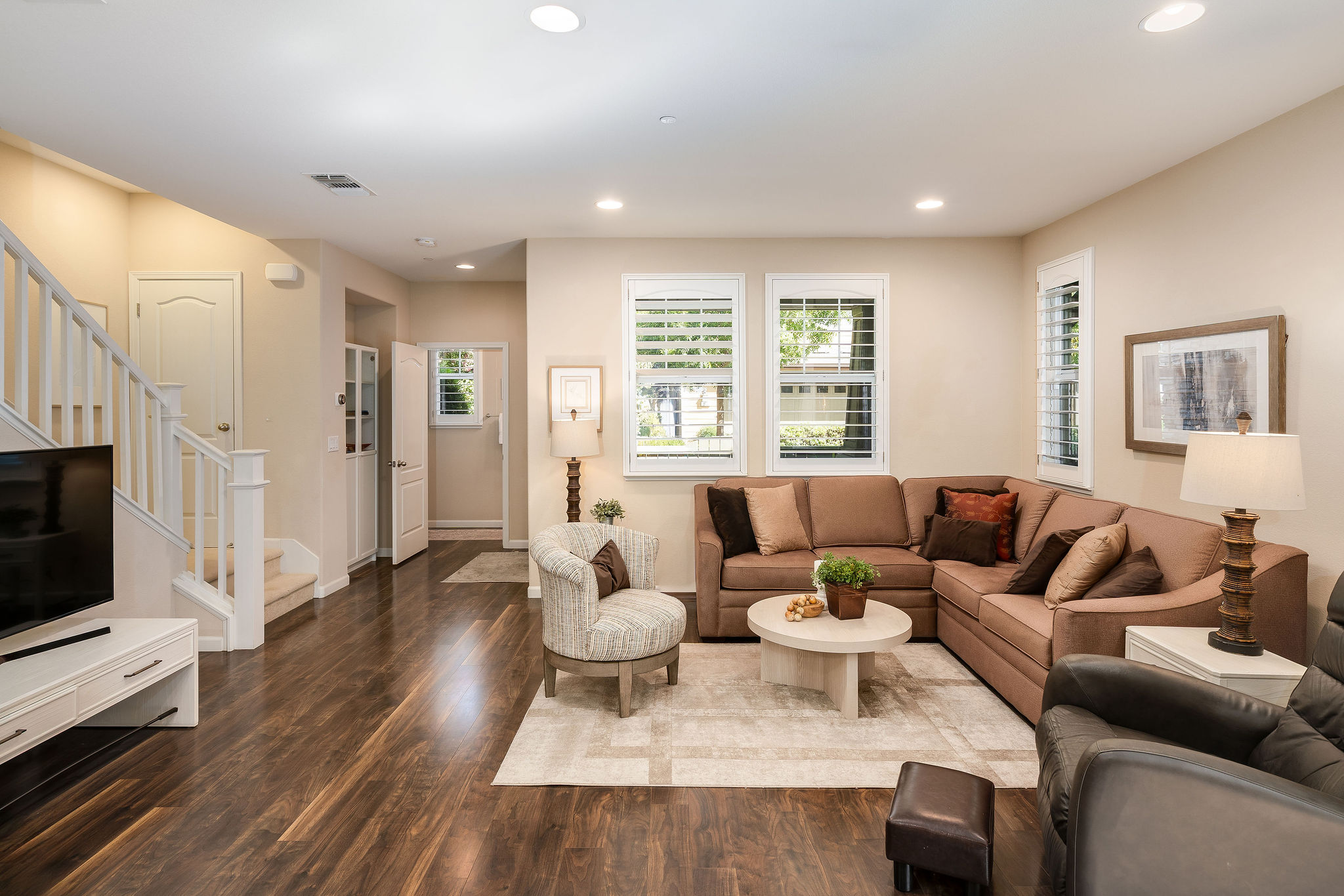 This rare corner unit is the largest floor plan in the community, offering three levels of thoughtful living space. Step through the gate into your own private front patio — a perfect spot for morning coffee or evening gatherings. Inside, a light-filled family room with custom shutters flows seamlessly into the dining area and kitchen, featuring