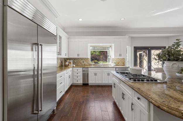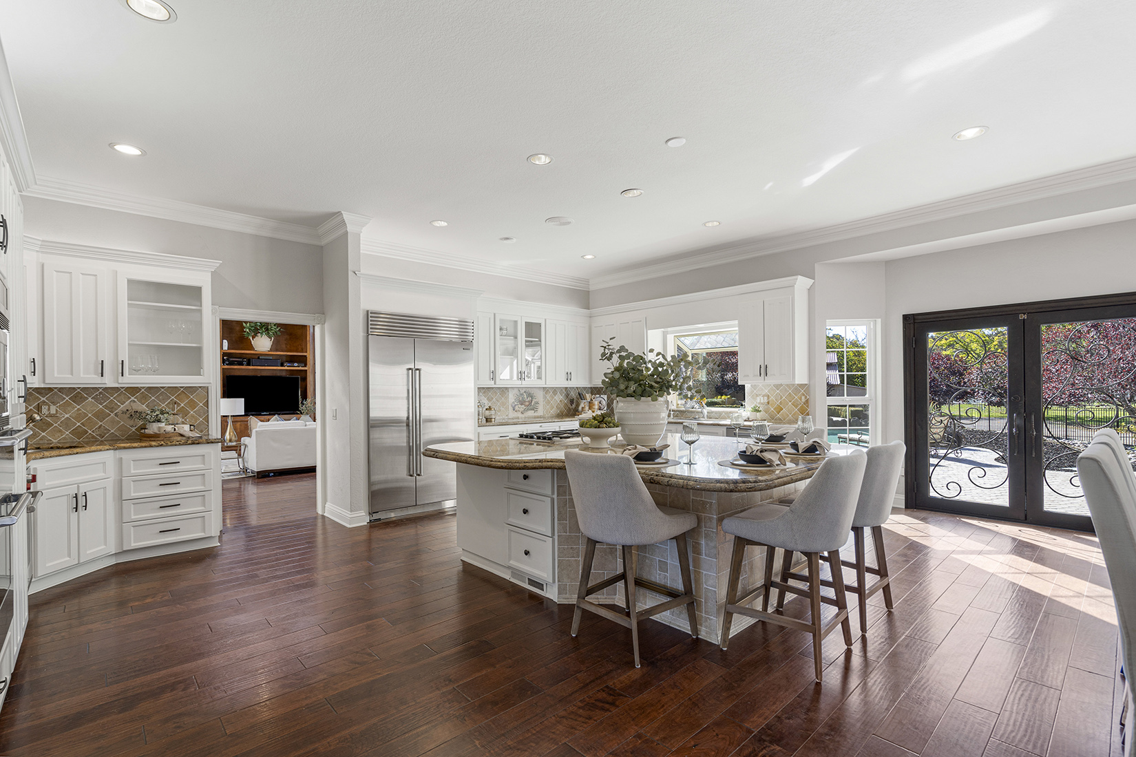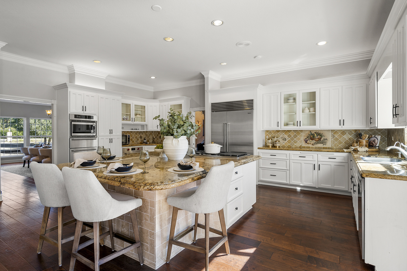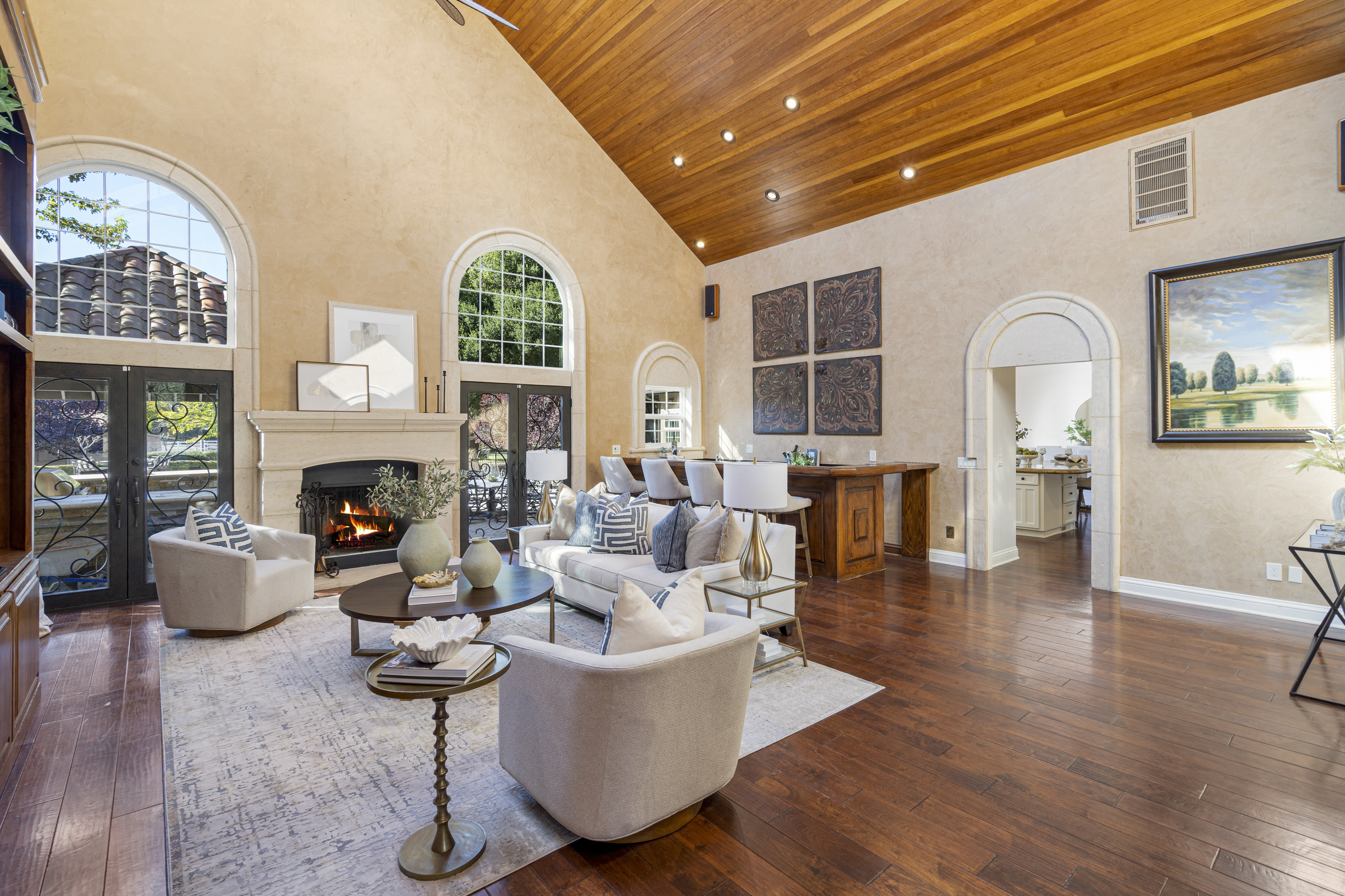 The chef’s kitchen is the heart of the home, featuring high-end stainless steel appliances, a spacious center island with seating, walk-in pantry, and large casual dining area. The spacious formal dining room can host large family get togethers and the living room intimate gatherings, while the family room showcases soaring ceilings, a fireplace, wraparound bar, and space for a large media setup.