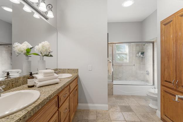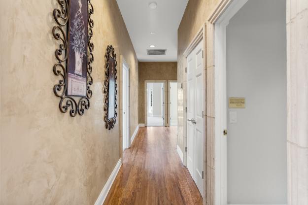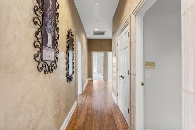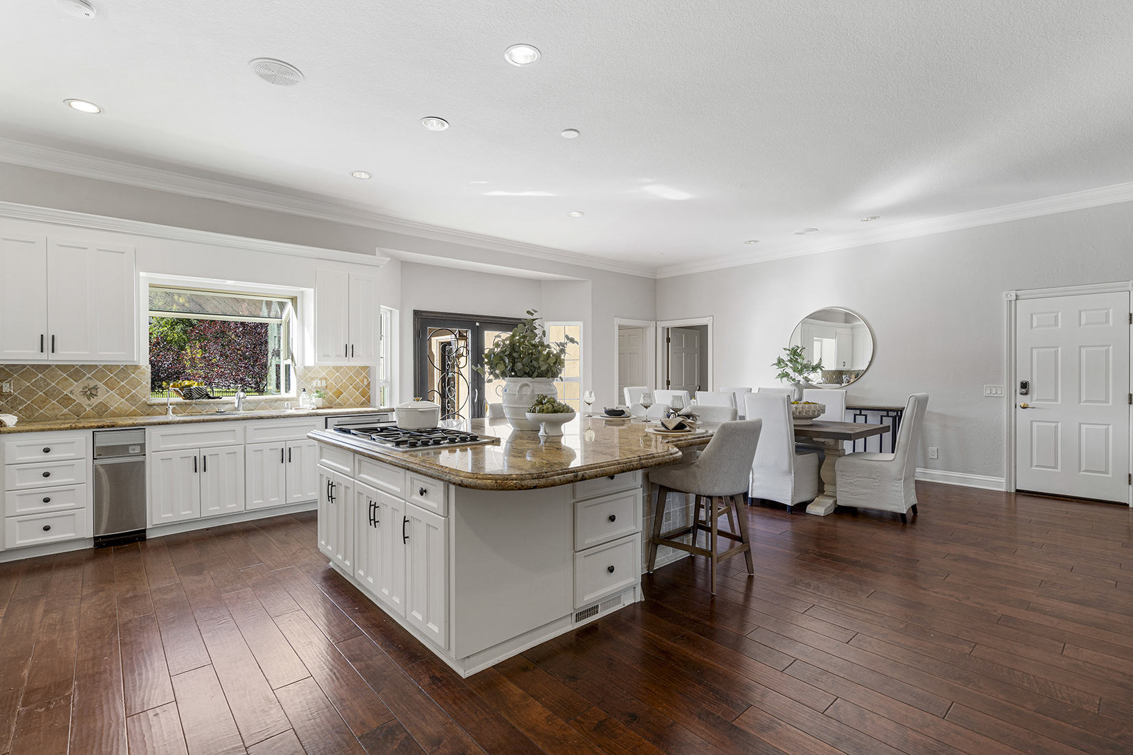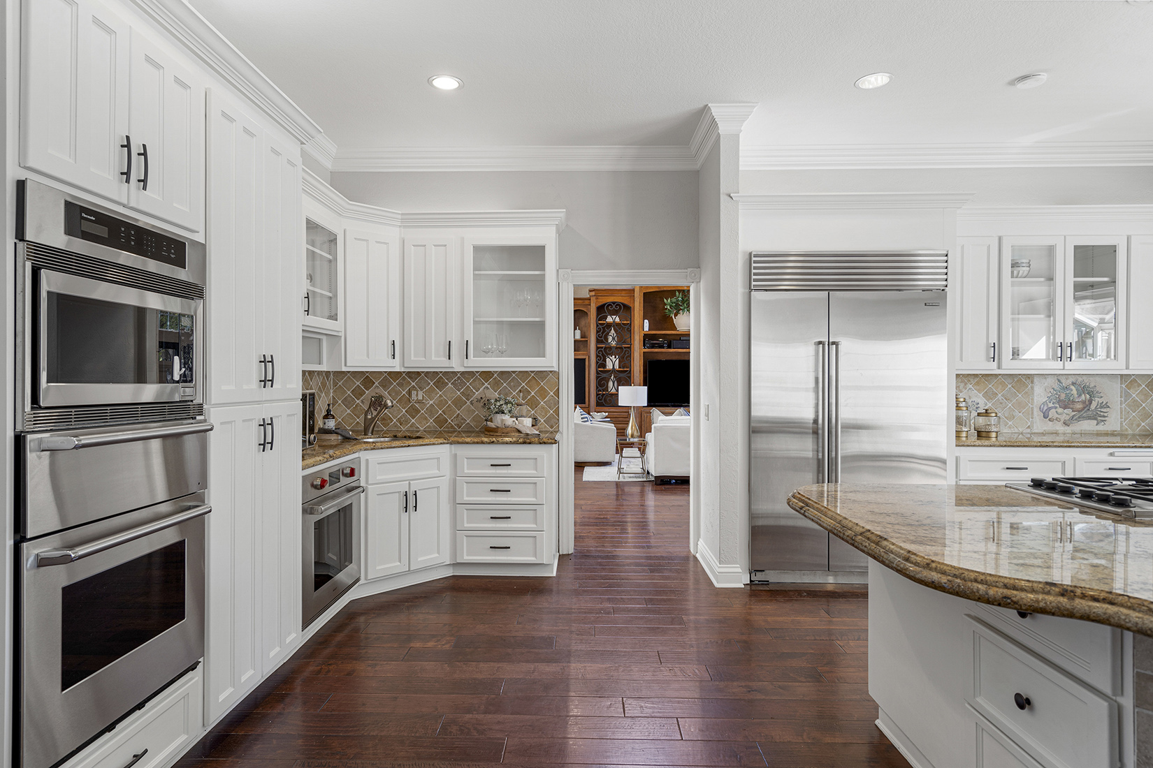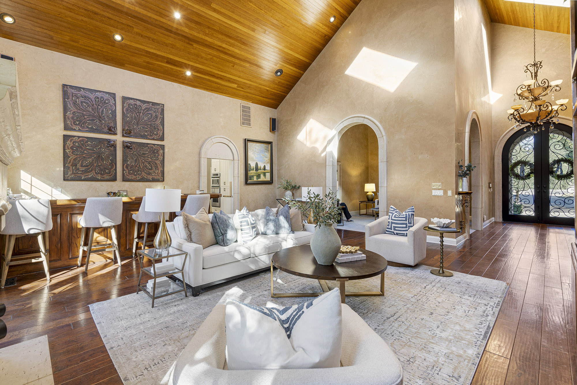 The chef’s kitchen is the heart of the home, featuring high-end stainless steel appliances, a spacious center island with seating, walk-in pantry, and large casual dining area. The spacious formal dining room can host large family get togethers and the living room intimate gatherings, while the family room showcases soaring ceilings, a fireplace, wraparound bar, and space for a large media setup.