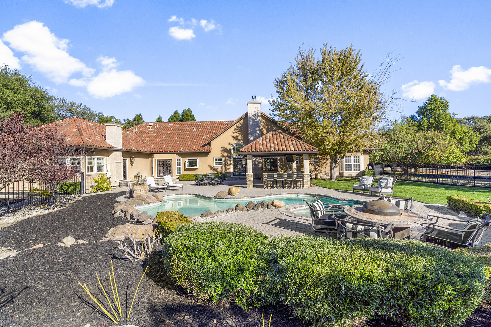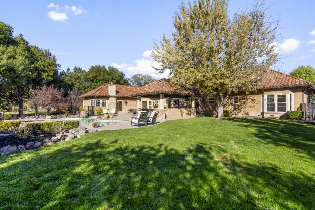 Outdoors, enjoy resort-style living with a covered pavilion and full outdoor kitchen, pool and spa, and expansive grounds lined with peach, apricot, plum, olive, walnut, and almond trees.