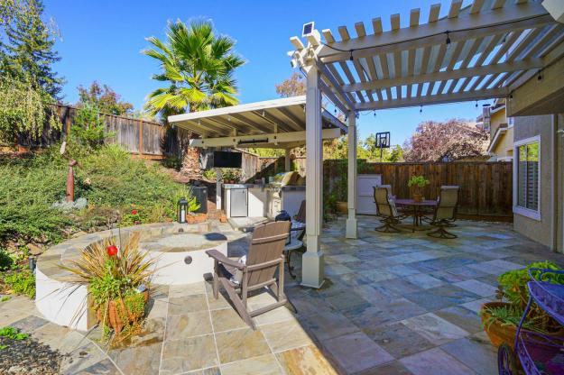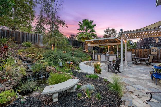 This two-story home is situated in the desirable Vista Tassajara neighborhood backing to open space. The main floor has many options for entertaining including an oversized living room with high ceilings, a formal dining room with access to the backyard patio, and a family room accentuated by a gas fireplace. The remodeled kitchen is beautifully lit by recessed and natural light and appointed with stainless steel appliances, granite countertops and an eating nook overlooking the backyard. The downstairs bedroom and full bath allow ample space for guests. Additional features include a newer dual zone HVAC, owned electrical solar, 3 car garage wired for an EV charger, remodeled primary bathroom with dual closets, new interior paint, and new light fixtures. Picture yourself entertaining family and friends on the large patio in the tranquil backyard where you will find the outdoor kitchen fully equipped with a BBQ, mini refrigerator, and TV covered by a pergola, a goldfish pond with a waterfall, and a built-in seating area with a gas fire pit. HOA amenities include pool + spa, playground and greenbelt. Near top rated schools, trails and all that Tassajara Crossings Shopping Center and Blackhawk Plaza have to offer.