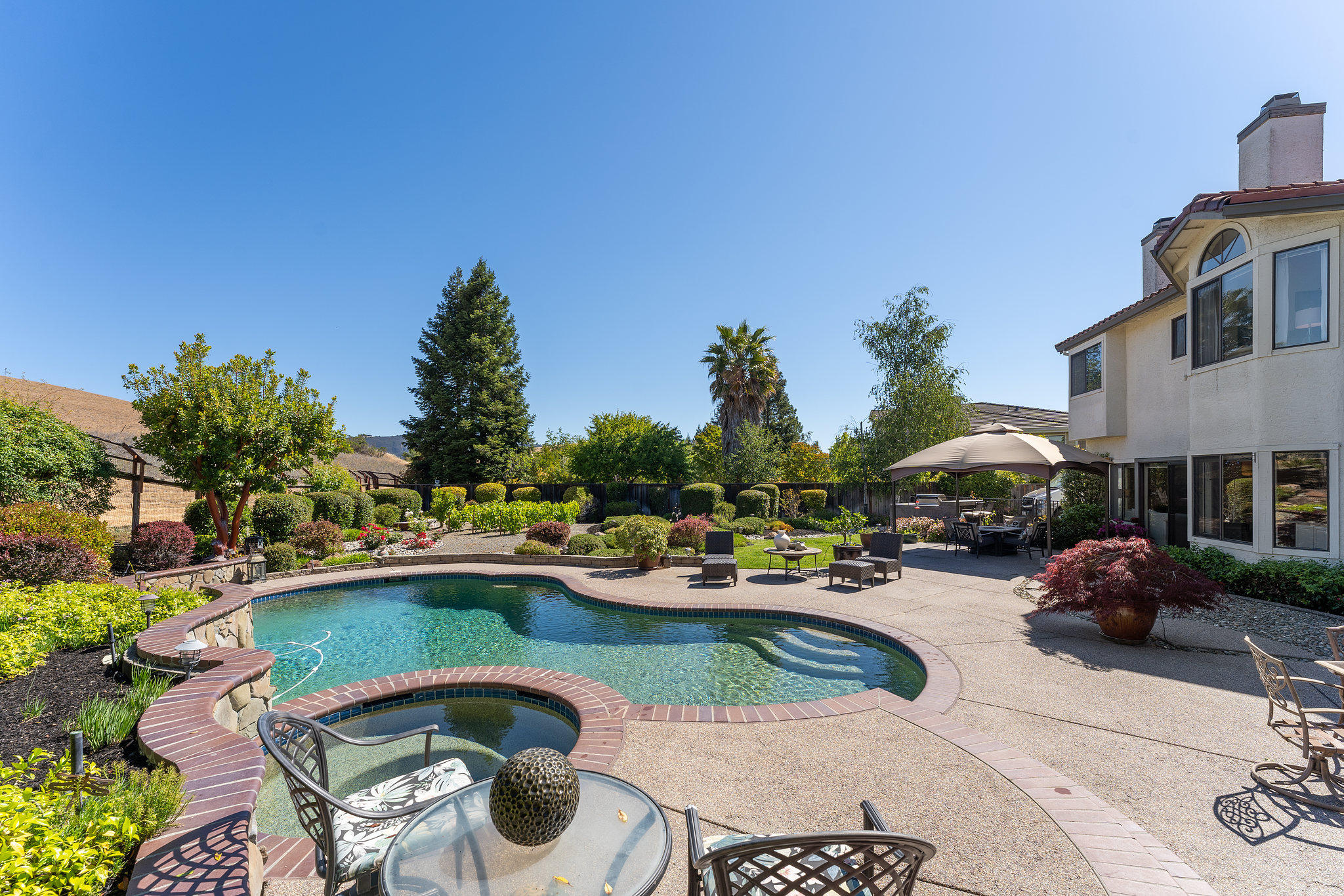 Situated on a coveted cul-de-sac in the sought after Cimarron Hills neighborhood, this 3126 SF home has a spectacular yard backing to open space. The two-story home features a desirable floor plan with 4 bedrooms, including an ensuite bedroom on the main floor, 3.5 baths, loft plus an additional downstairs room ideal for an office. The curved staircase completes the grand foyer with high ceilings that flows effortlessly into the formal living room and adjacent dining room. Get ready to cook in the beautiful eat-in kitchen well equipped with granite counters, double ovens, SS appliances, wine fridge, pantry and a detached moveable island. Defined by a gas burning fireplace, the oversized family room has hardwood floors, and a sliding door to the outdoor oasis. On the second level, there are 3 bedrooms including the primary ensuite bedroom with an updated bath, a shared bathroom and spacious loft. With access to open space, the resort style backyard offers a pebble tec pool + spa and built-in bar with a propane BBQ. On over a third of an acre, this home is surrounded by lush landscaping with pear, kumquat and plum trees, and a vineyard growing 15 various types of grapes. Owned solar, RV parking, hardwood flooring, 3 fireplaces and Nest Thermostats are just some of the additional highlights. Refrigerator, washer and dryer are included. Community amenities include tennis courts, clubhouse, playground and community pool.