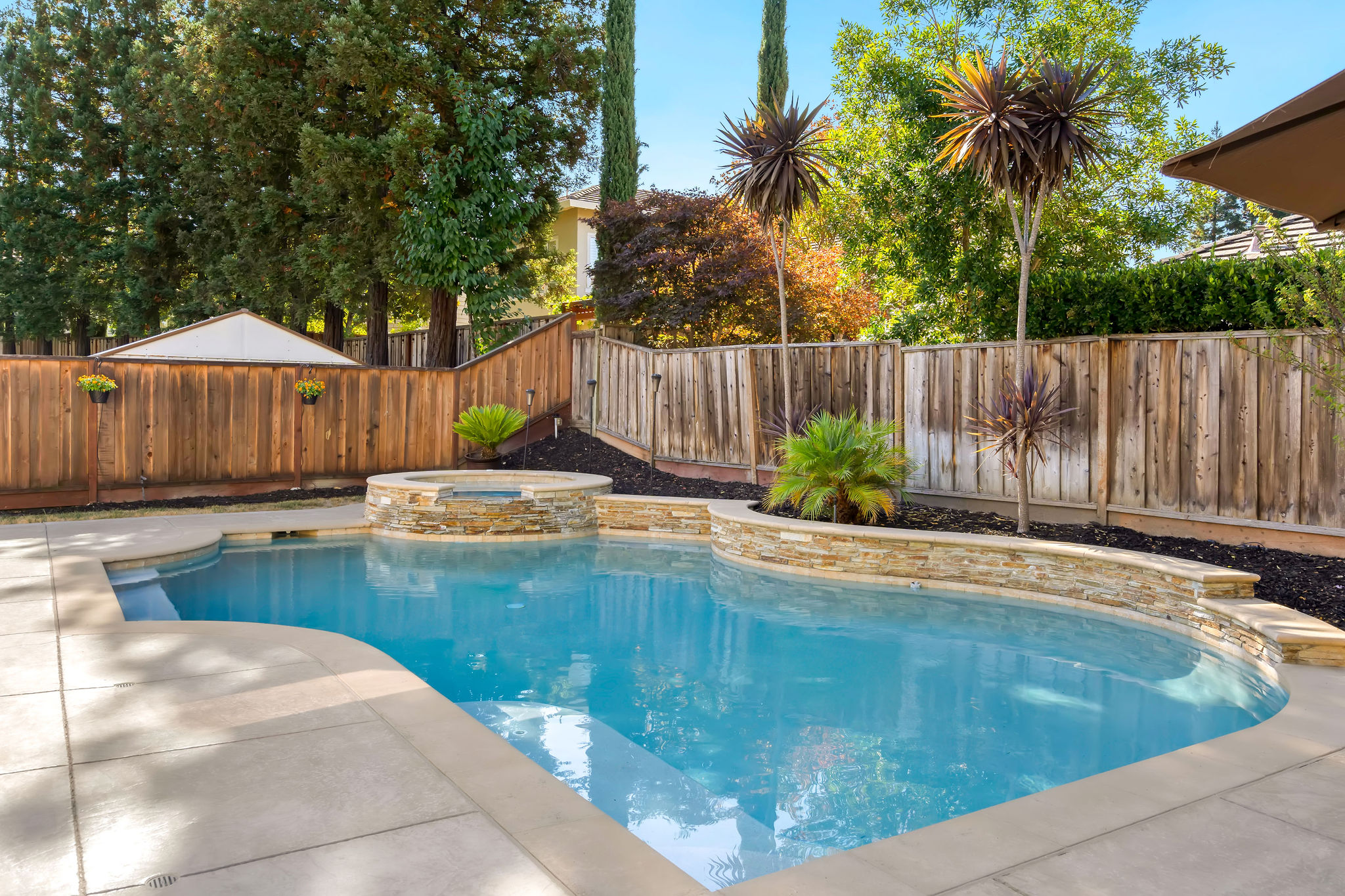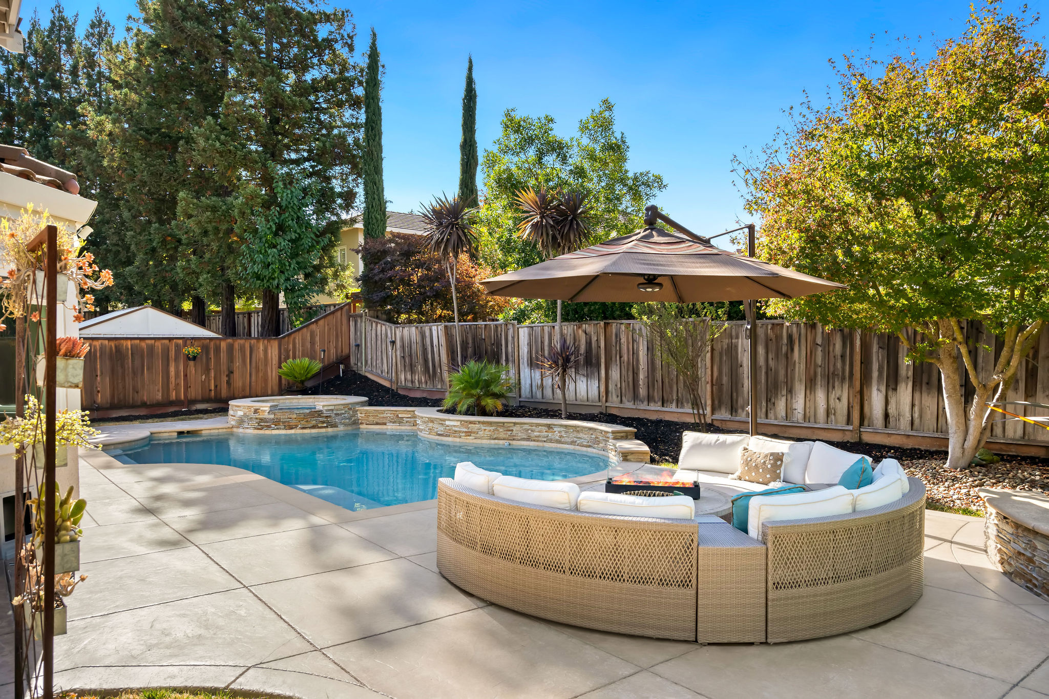 Nestled at the end of a serene cul-de-sac in Vista Tassajara, adjacent to the picturesque community park, this stunning Northeast facing mid-century modern home boasts luxurious upgrades throughout. As you enter the home, you'll be welcomed by hardwood floors and soaring ceilings in the foyer, which flow seamlessly into the expansive living room centered by a fireplace. Ideal for entertaining, the adjacent formal dining room offers a built-in wine fridge and a French door that opens to one of the outdoor patios, effortlessly blending indoor and outdoor spaces. The gorgeous remodeled kitchen is appointed with a waterfall edge quartz countertop breakfast bar, top-of-the-line stainless steel appliances, and a breakfast nook with an abundance of storage. Open to the kitchen, the family room invites relaxation with its Terrazzo tile flooring, built-in speakers, gas fireplace and French doors to access the backyard. The main floor also offers a versatile bedroom which could be utilized as an office with a convenient full bathroom next to it. The sleek cable railing staircase takes you upstairs to double doors that open to the primary bedroom suite featuring dual walk-in closets, new carpet, and vaulted ceilings. The remodeled spa inspired bath showcases a floating double vanity, and a doorless walk-in shower with a linear drain, freestanding tub and floor to ceiling ribbon tile. Down the hall, there are two front-facing bedrooms that share a hall bathroom. Step outside to discover a backyard oasis designed for privacy and entertaining, including a solar saltwater pool with built-in spa, and two expansive patios surrounded by lush landscaping, providing the perfect backdrop for outdoor gatherings. Additional highlights of this exceptional home include a Tesla Solar Purchase Agreement, spacious three-car garage, and laundry room with a sink and side yard access. A walking path leads from the end of the cul-de-sac to the community amenities featuring a large greenbelt, playground and pool/spa. Close to top rated schools, trails and all that the Tassajara Crossings Shopping Center and Blackhawk Plaza have to offer.